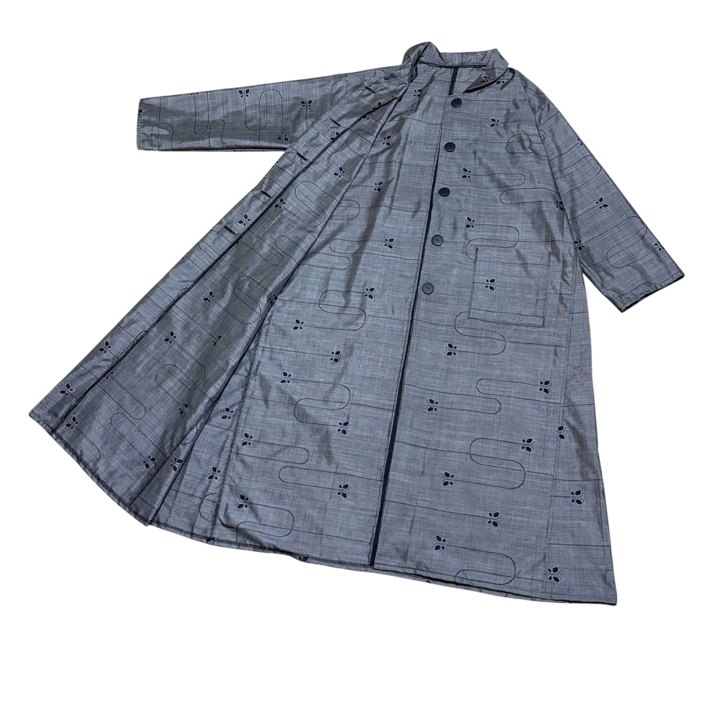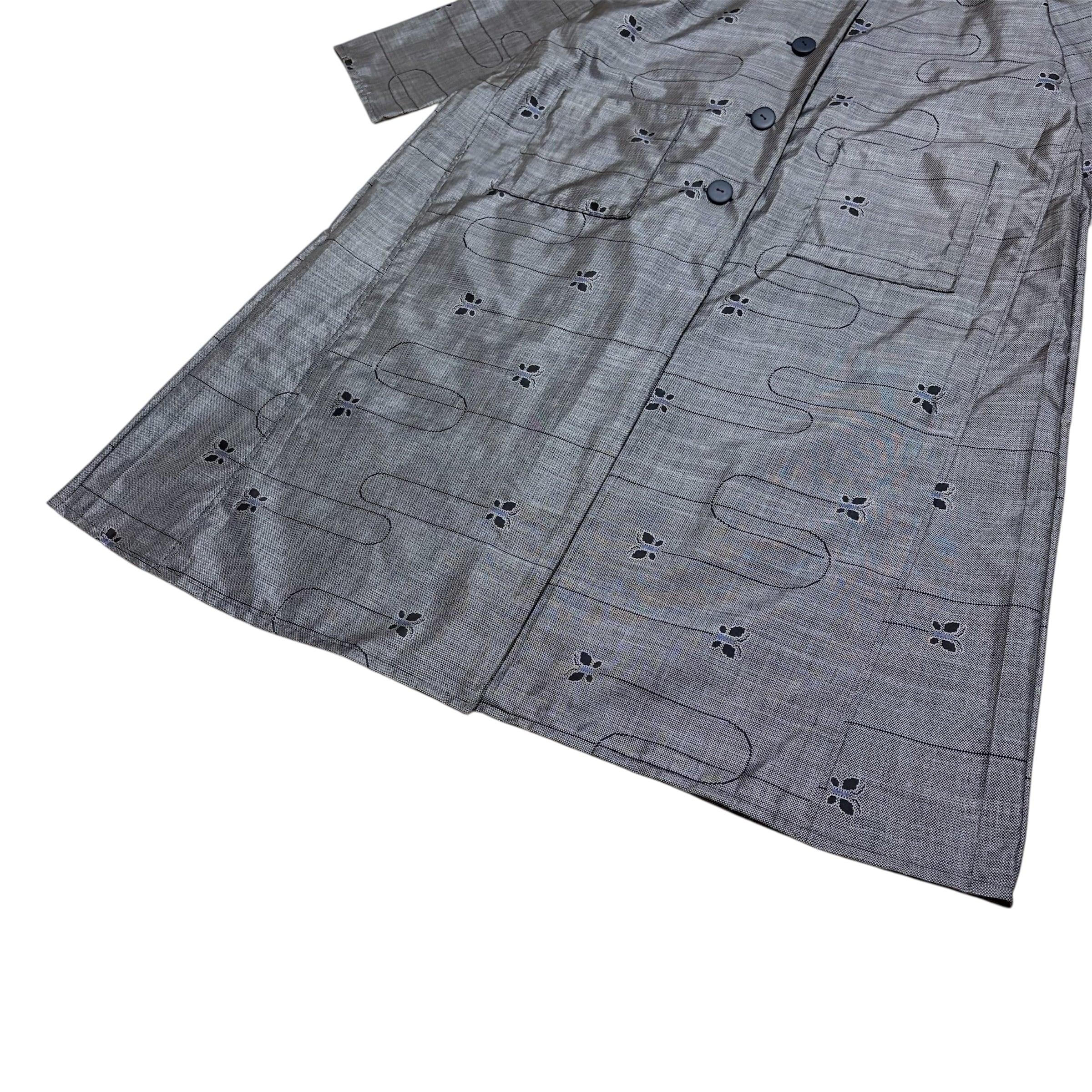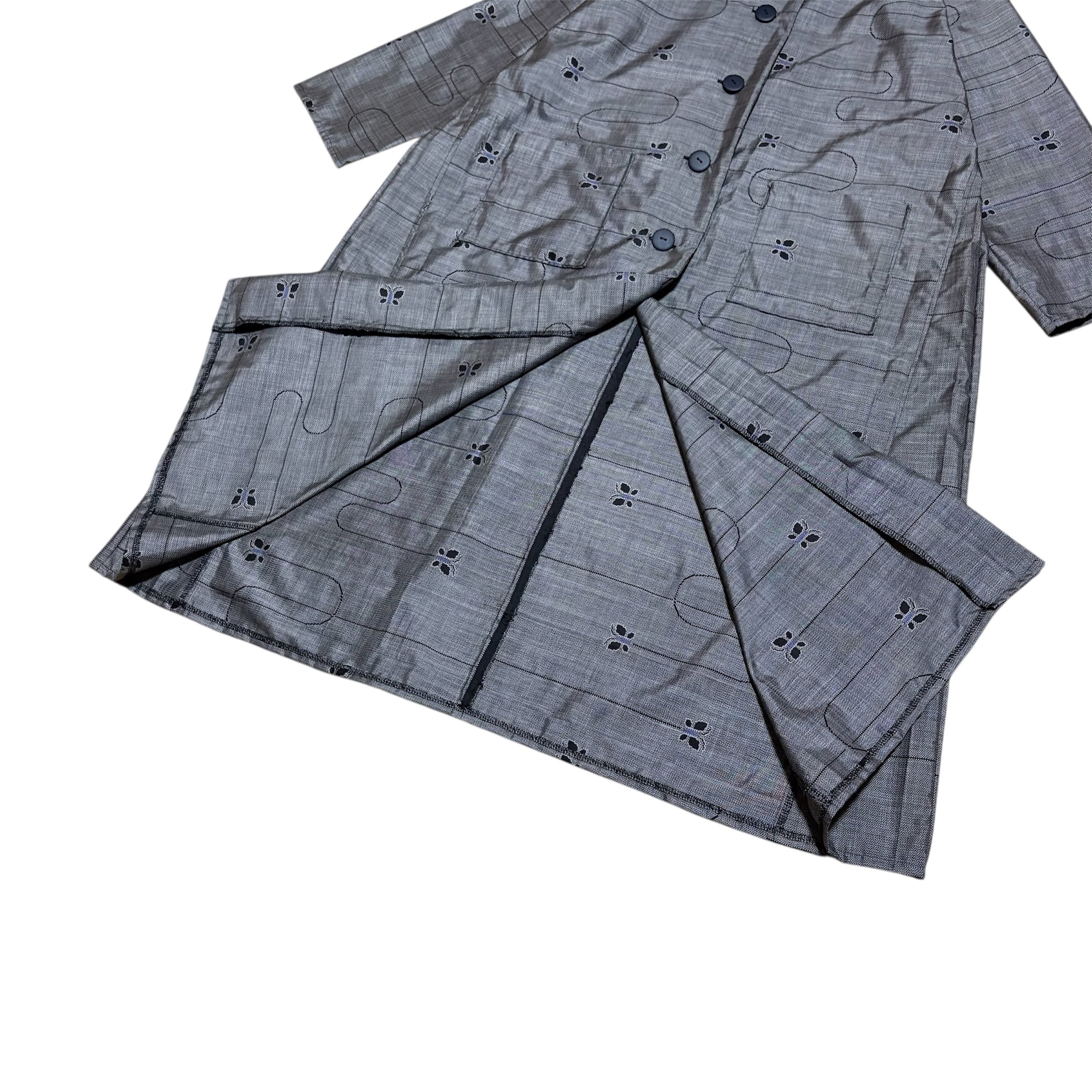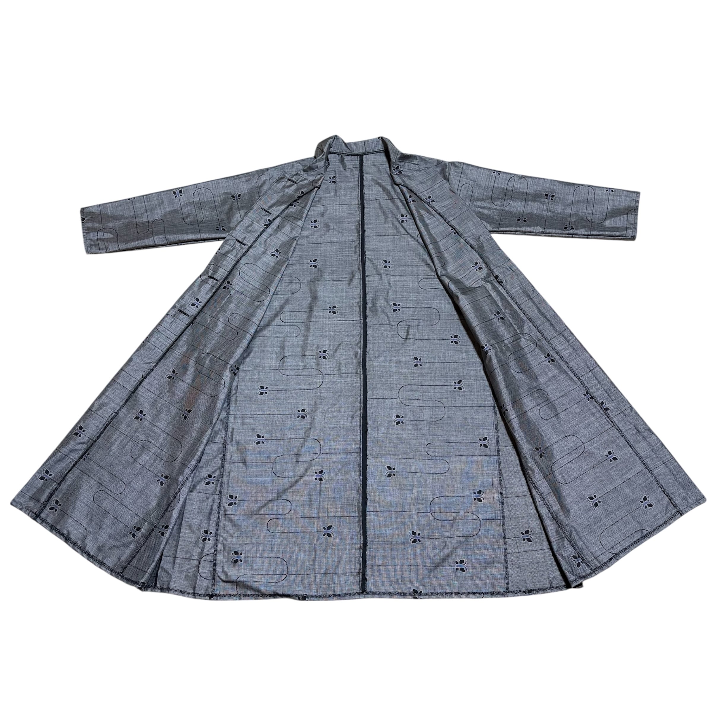 着物リメイク 9マルキ大島紬生地 ロングコート シャツワンピース 舞蝶文様 丸襟 グレー