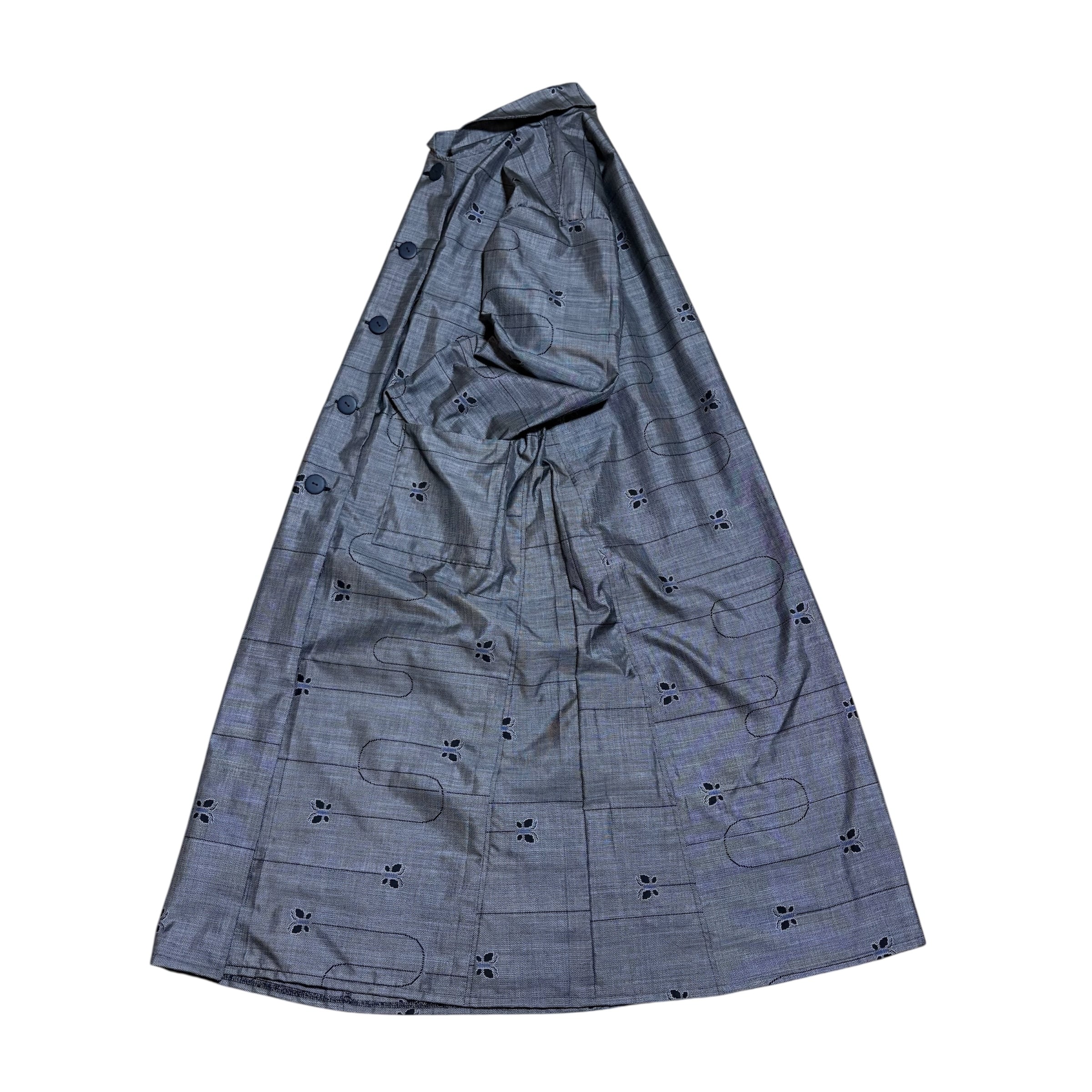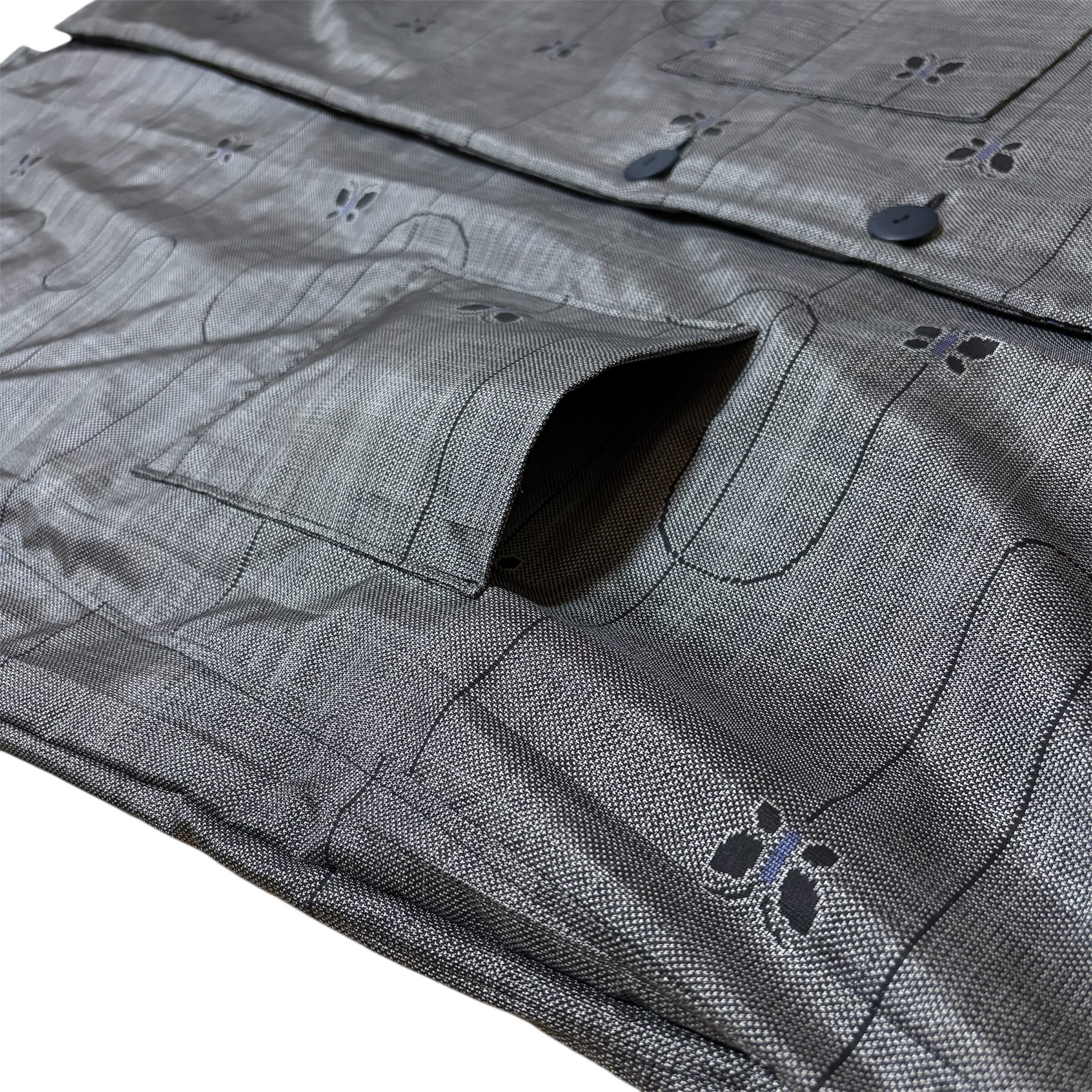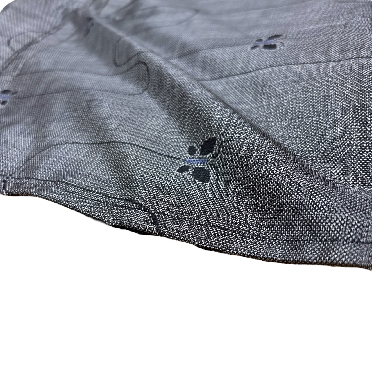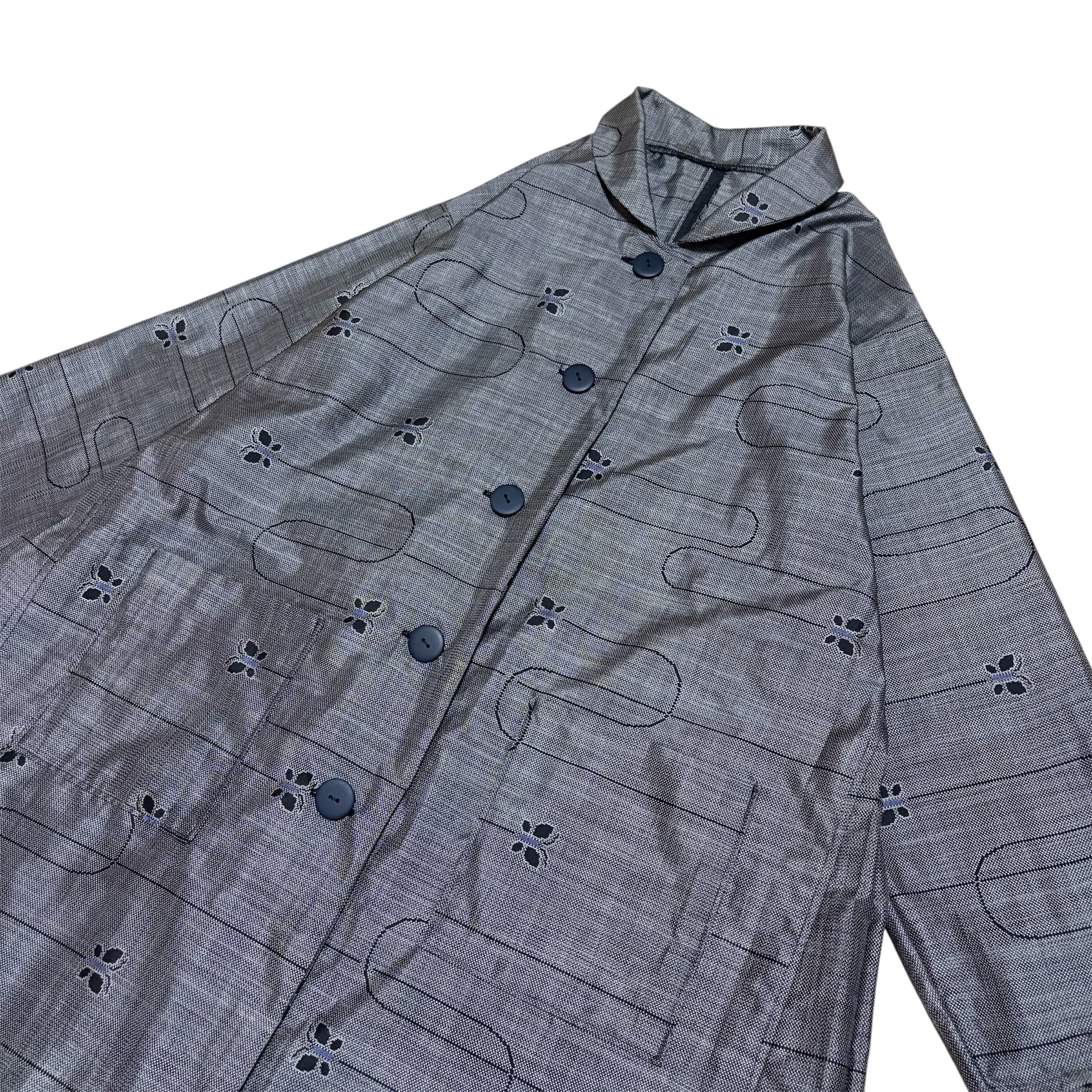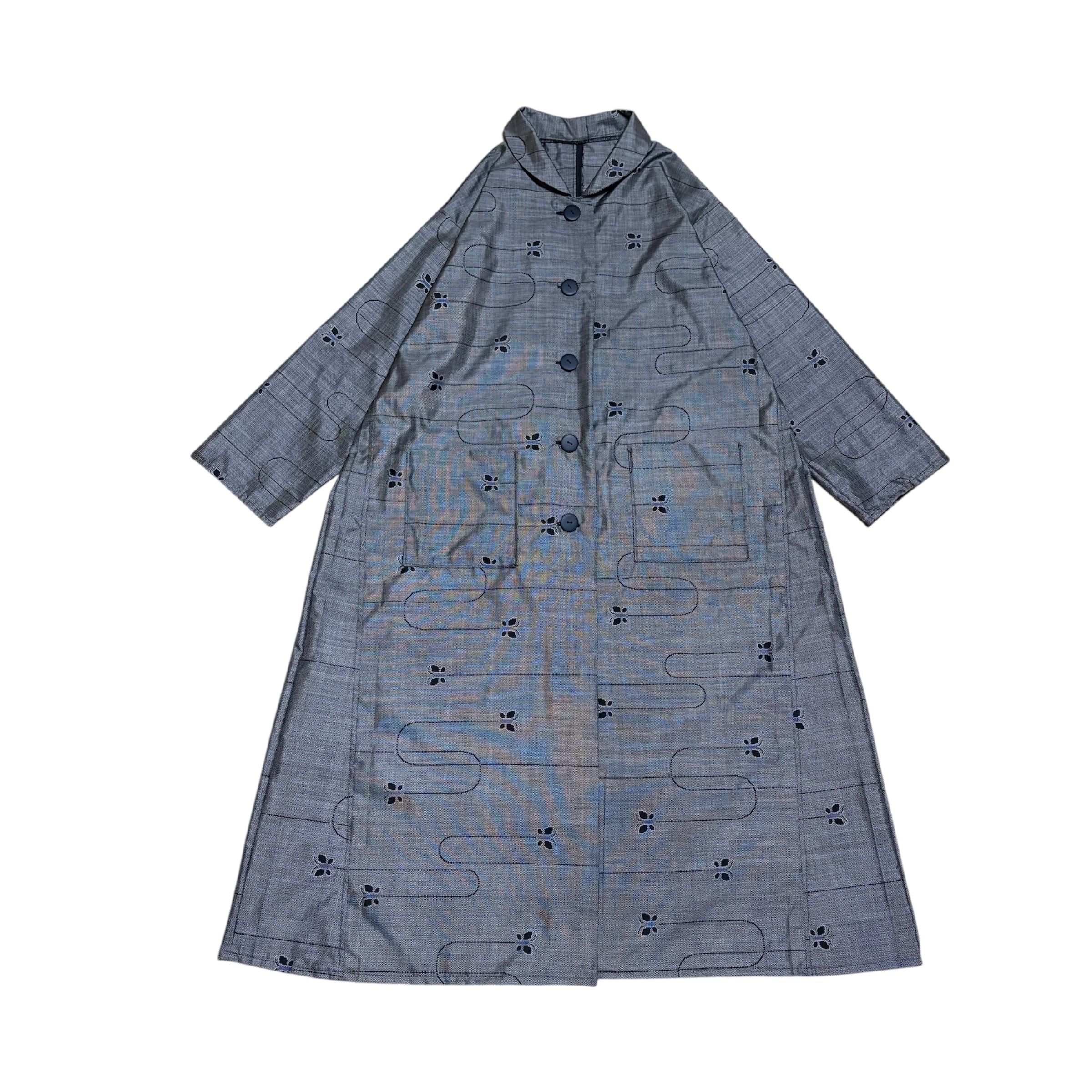着物リメイク 9マルキ大島紬生地 ロングコート シャツワンピース 舞蝶文様 丸襟 グレー