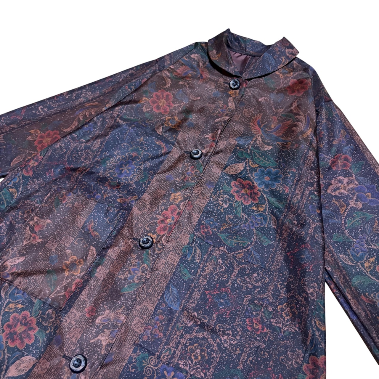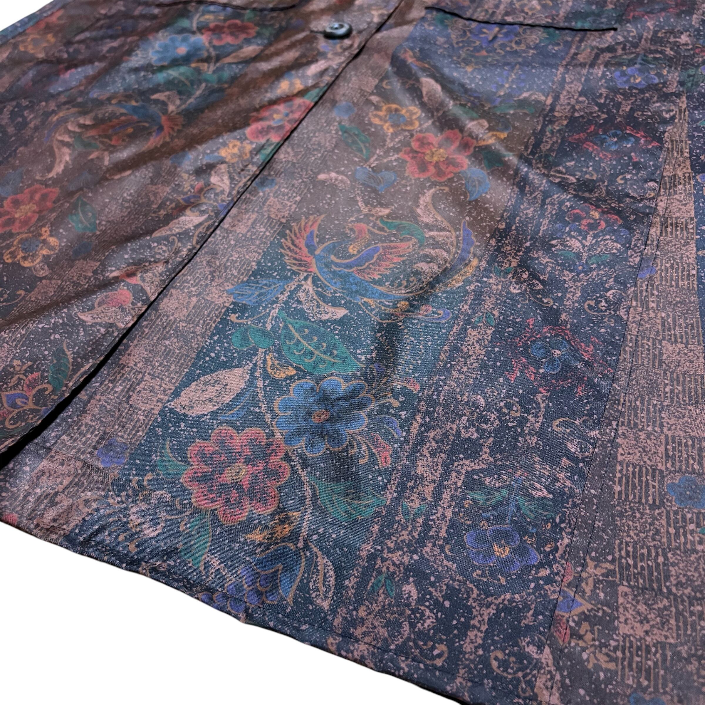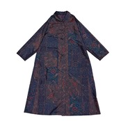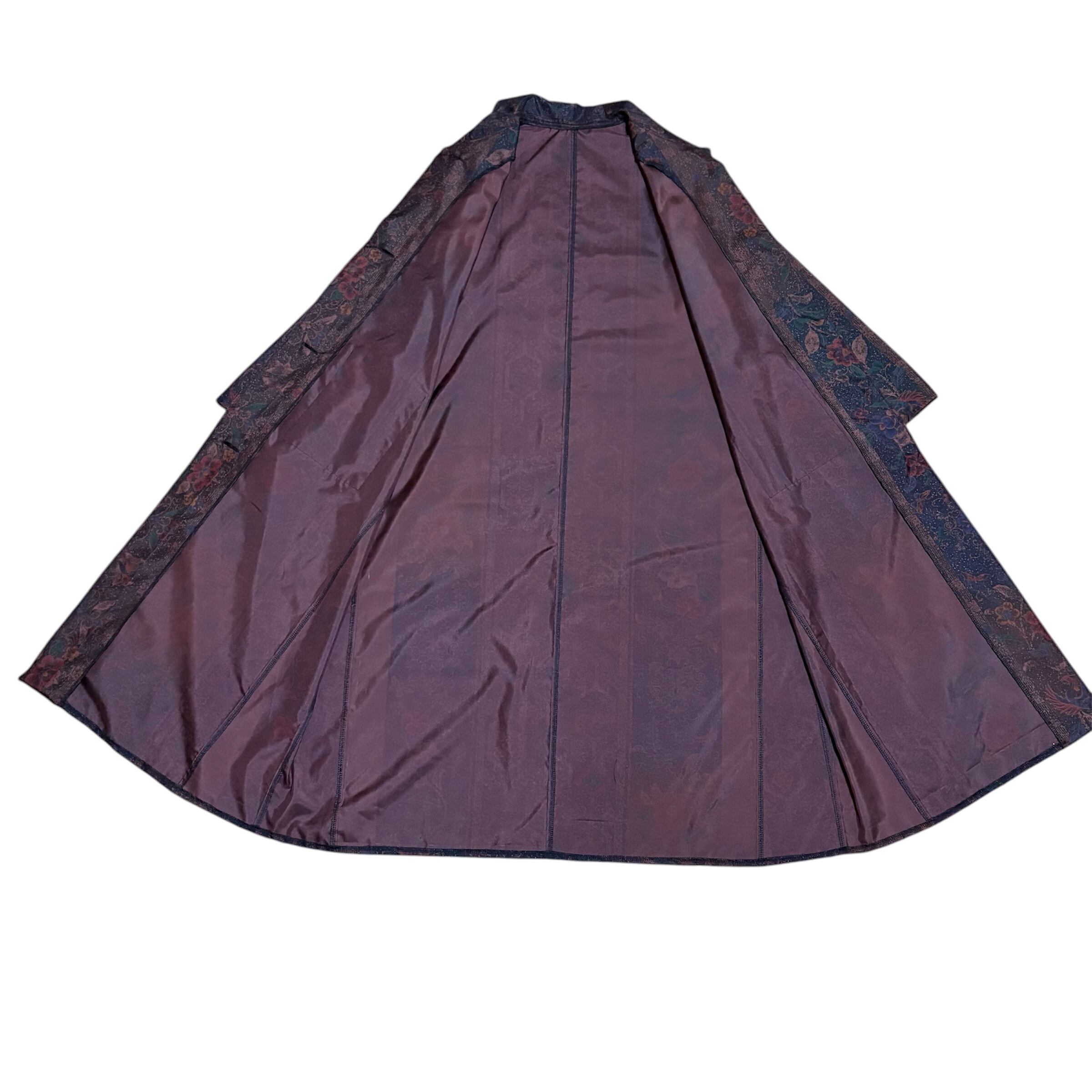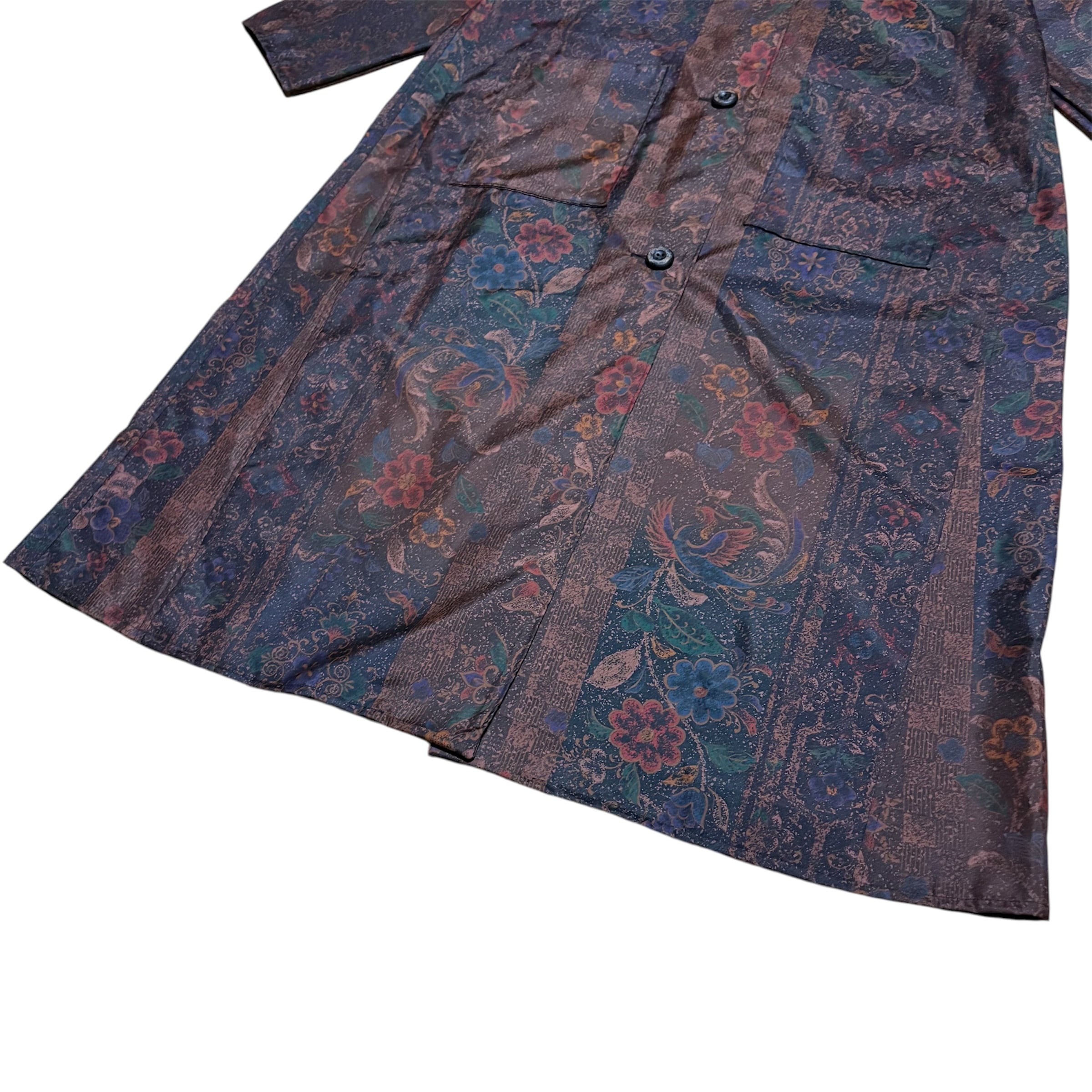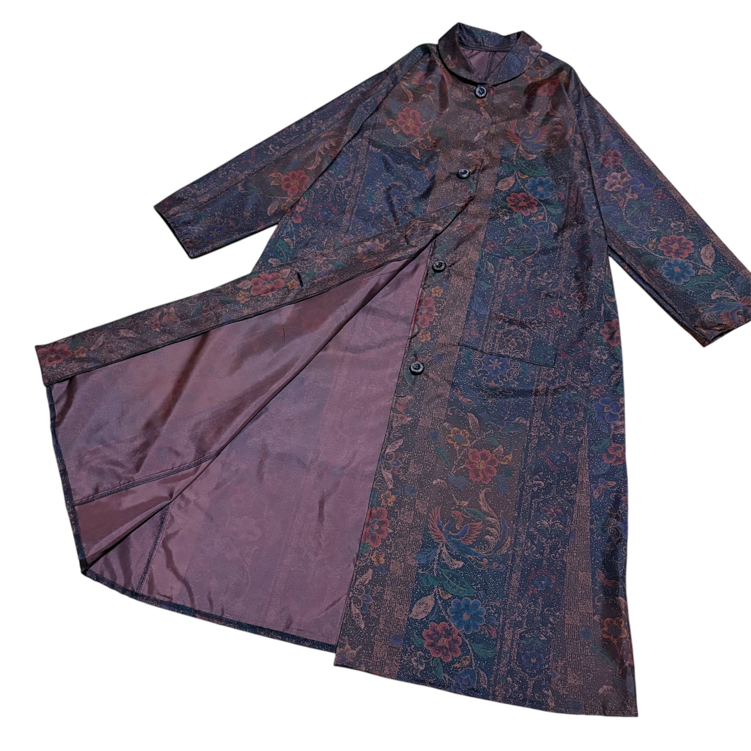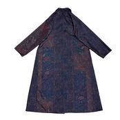 本場染大島紬 コートワンピース 丸襟 鳳凰更紗花蝶文様 ロング フレア ブラウン