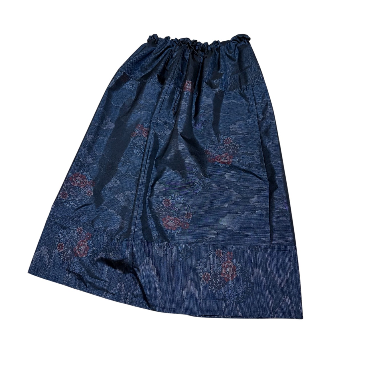 大島紬 着物リメイク 巾着スカート 雲取花文様×抽象文様 ロング りぼんひも 裏地あり