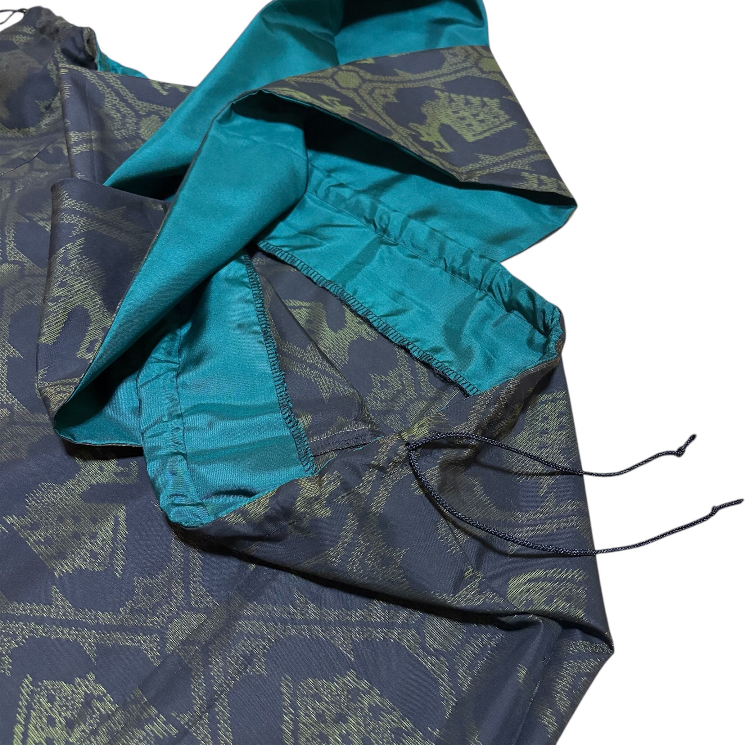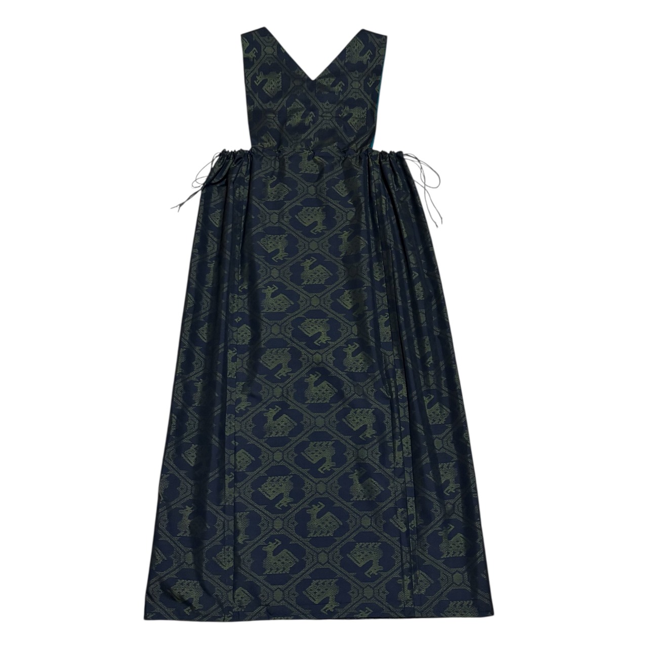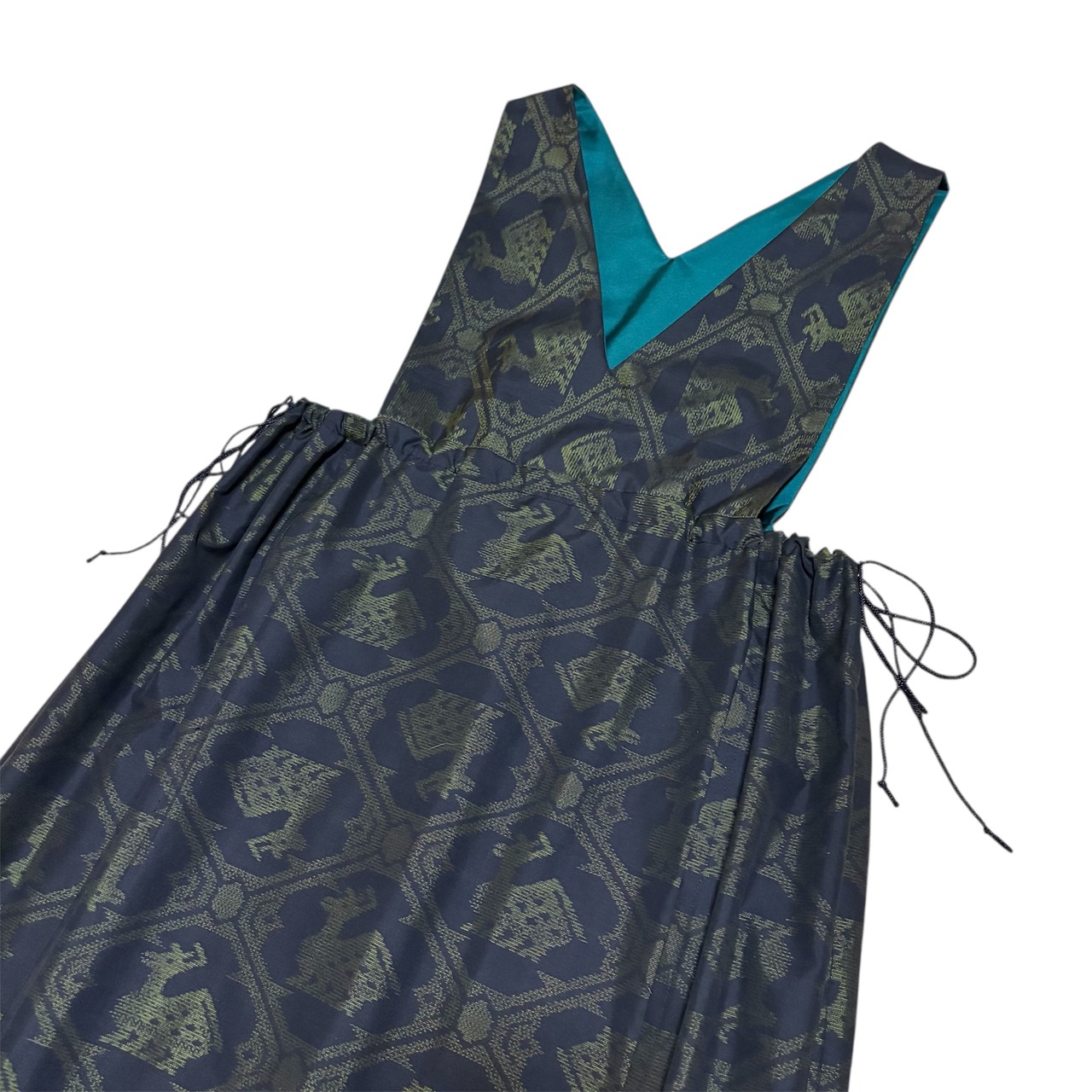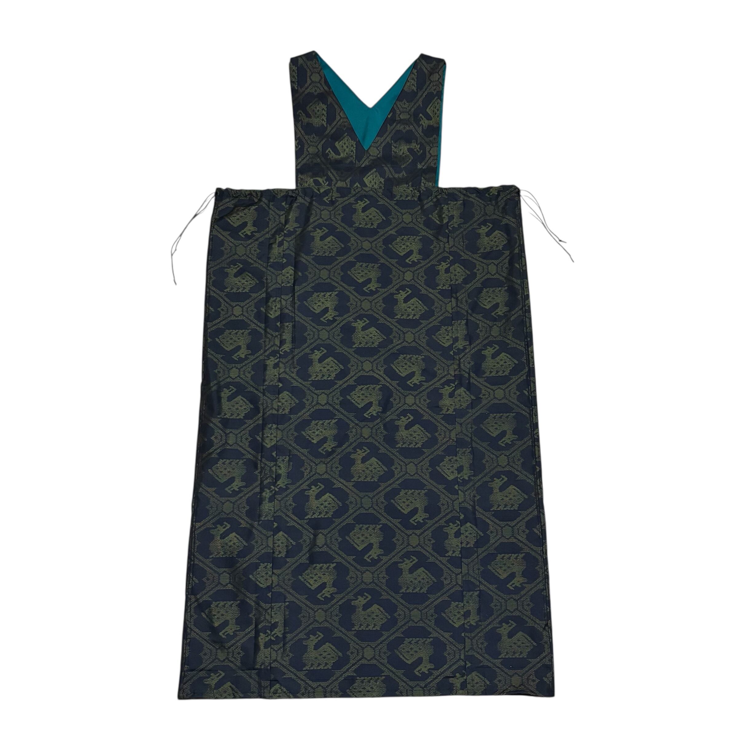 大島紬 着物リメイク ジャンパースカート 巾着スタイル 有栖川文様 鹿柄 アニマル 泥染め ブラック×グリーン 打掛ひも 幅広ウエスト ロング マキシ丈