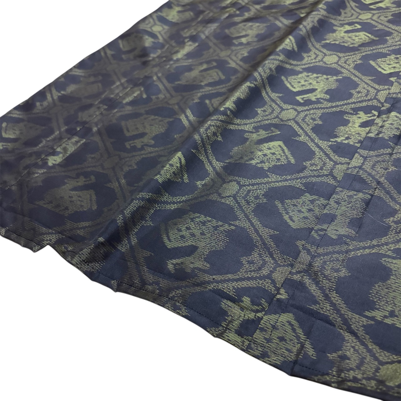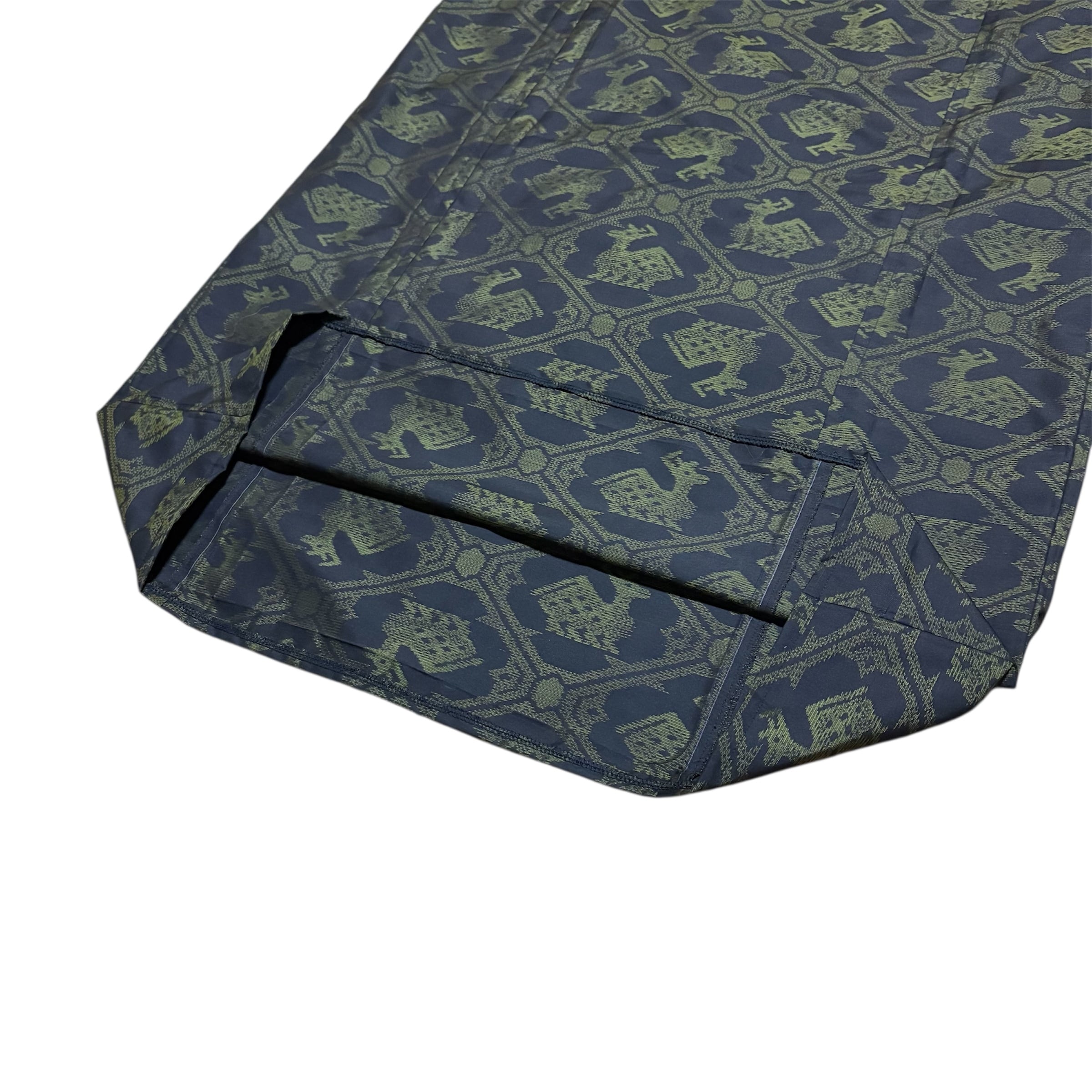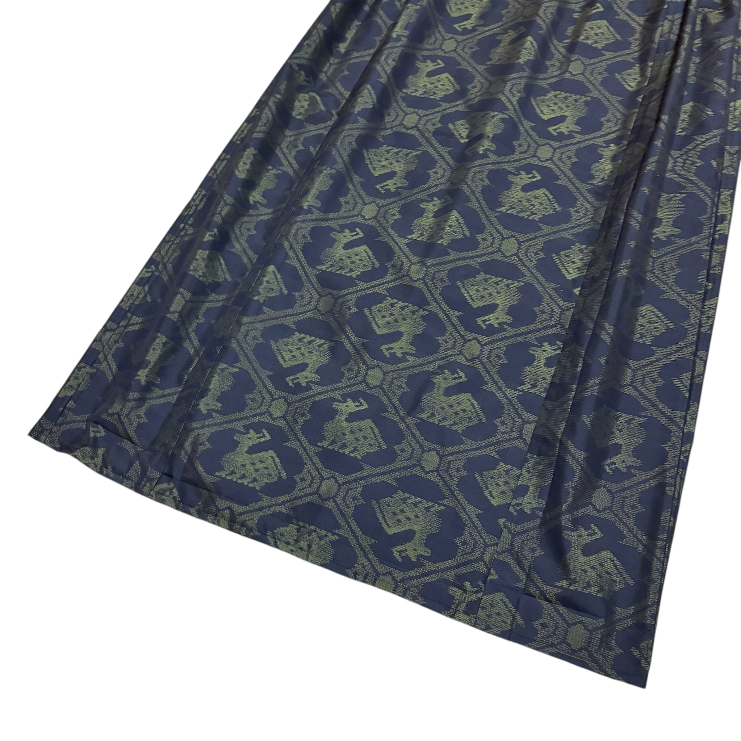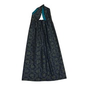 大島紬 着物リメイク ジャンパースカート 巾着スタイル 有栖川文様 鹿柄 アニマル 泥染め ブラック×グリーン 打掛ひも 幅広ウエスト ロング マキシ丈