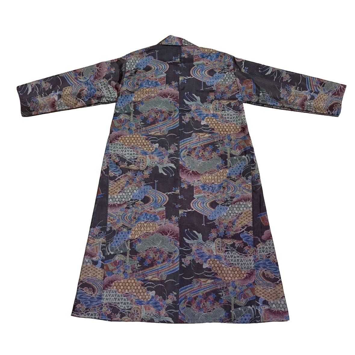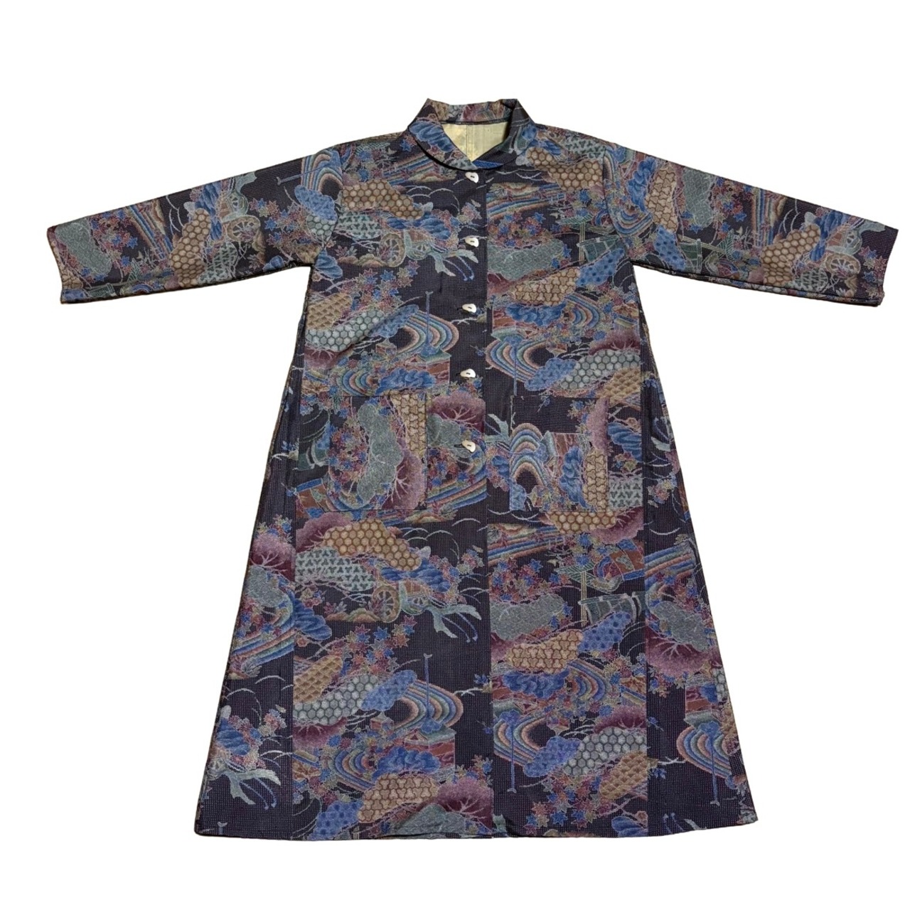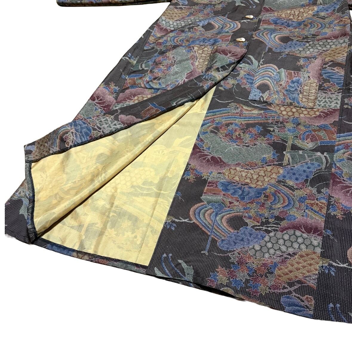 本場染大島紬 コートワンピース 丸襟 風景文様 ロング フレア 水流 吉祥 建築物