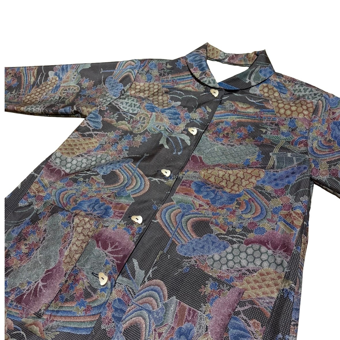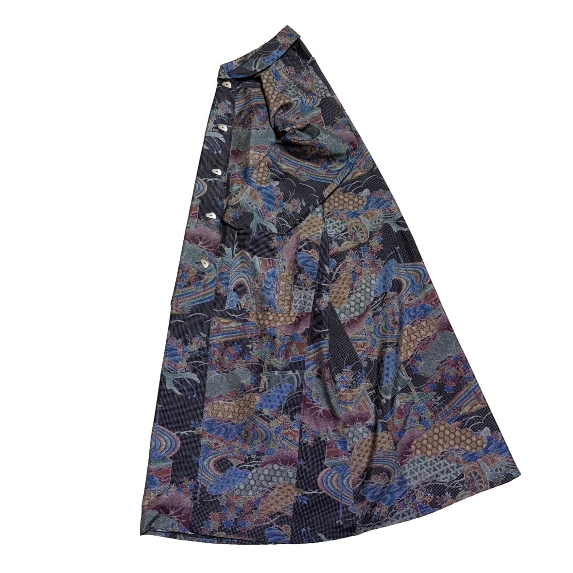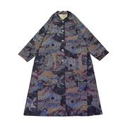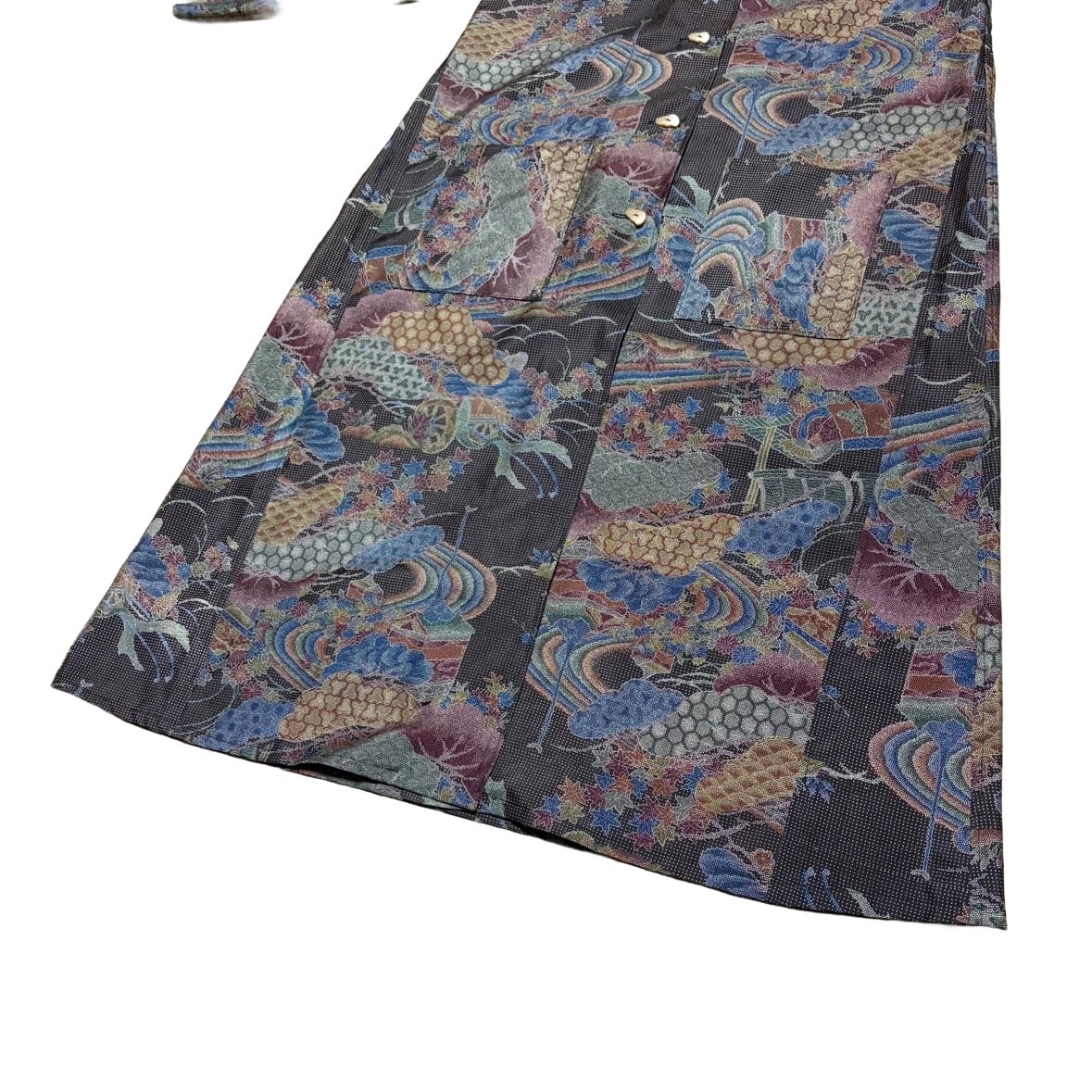 本場染大島紬 コートワンピース 丸襟 風景文様 ロング フレア 水流 吉祥 建築物