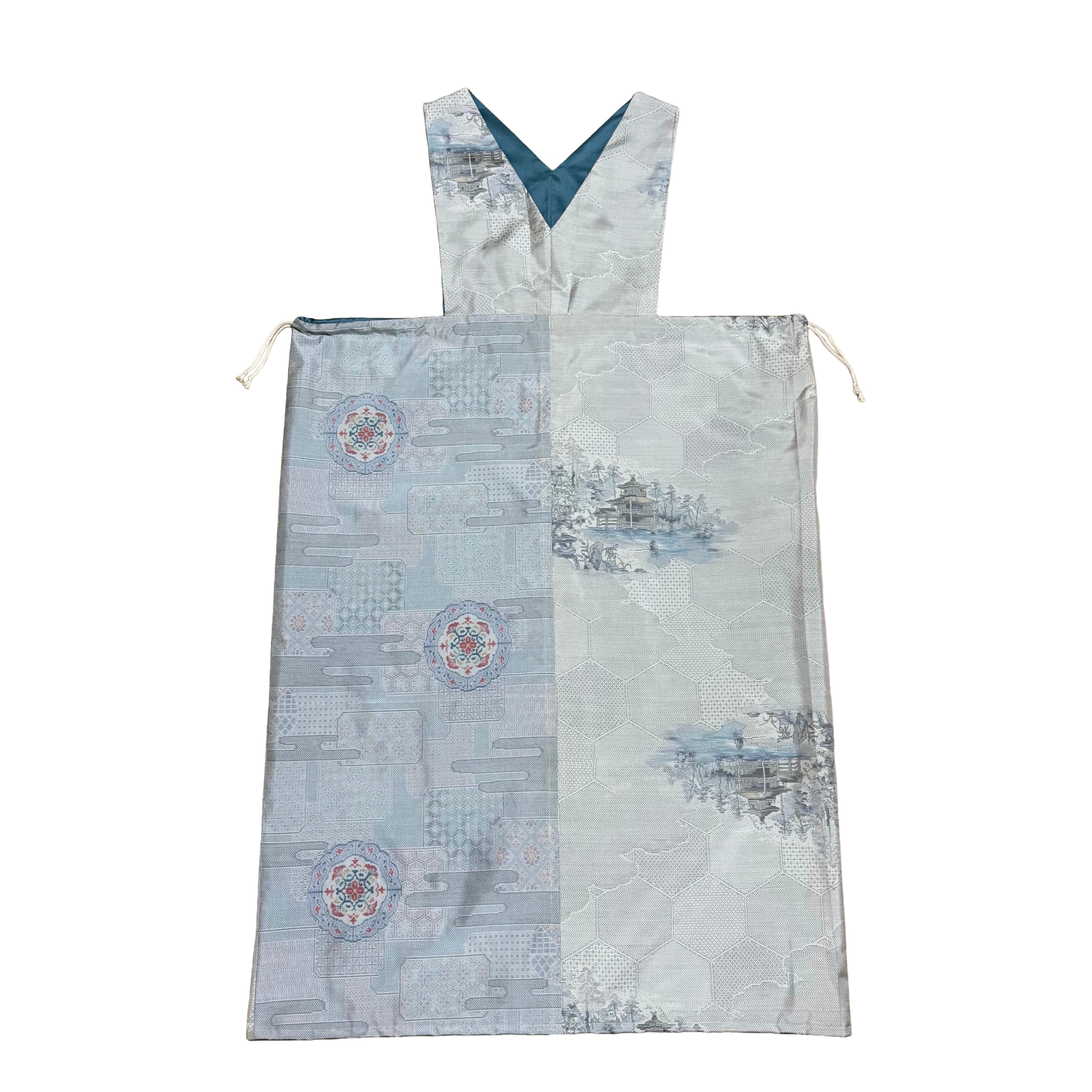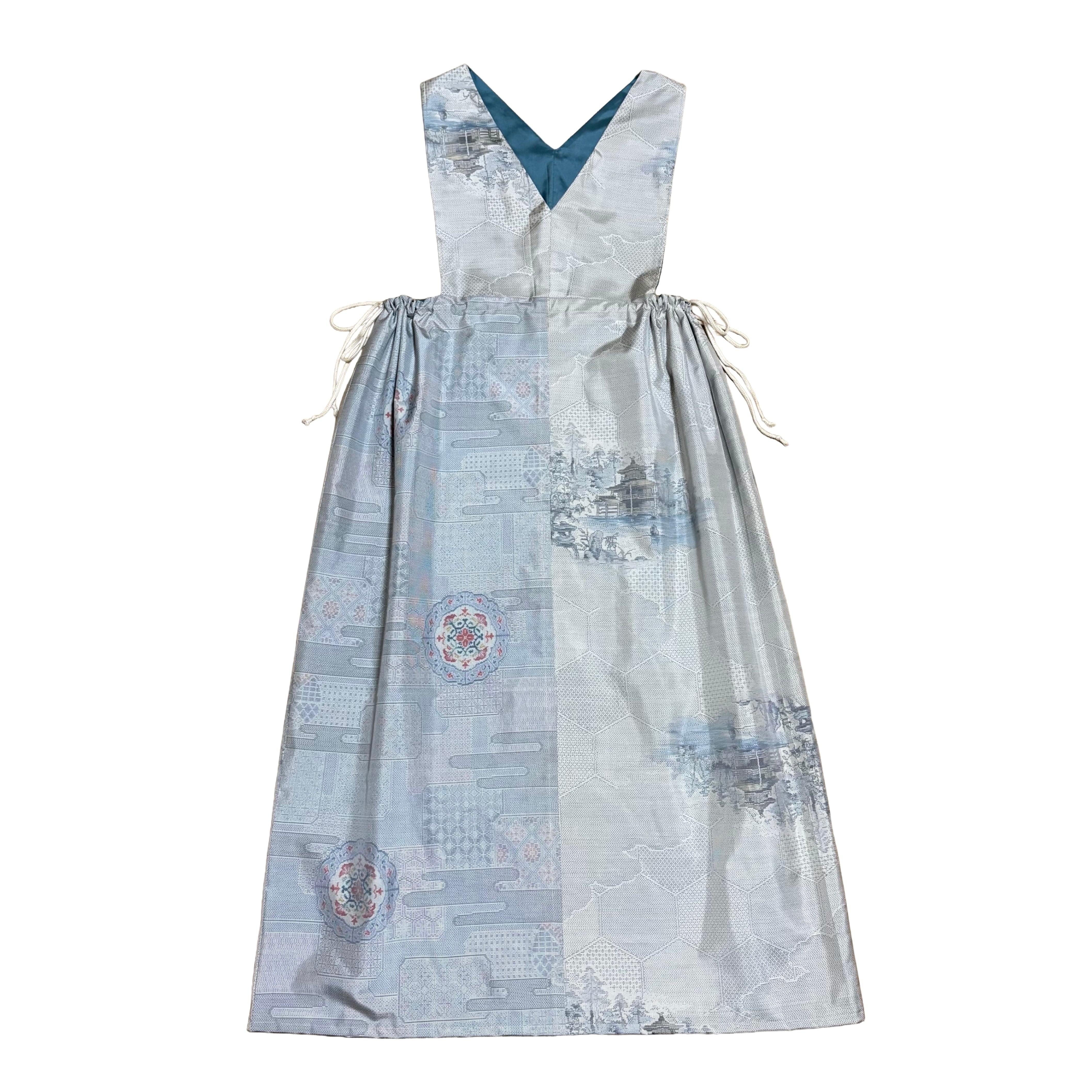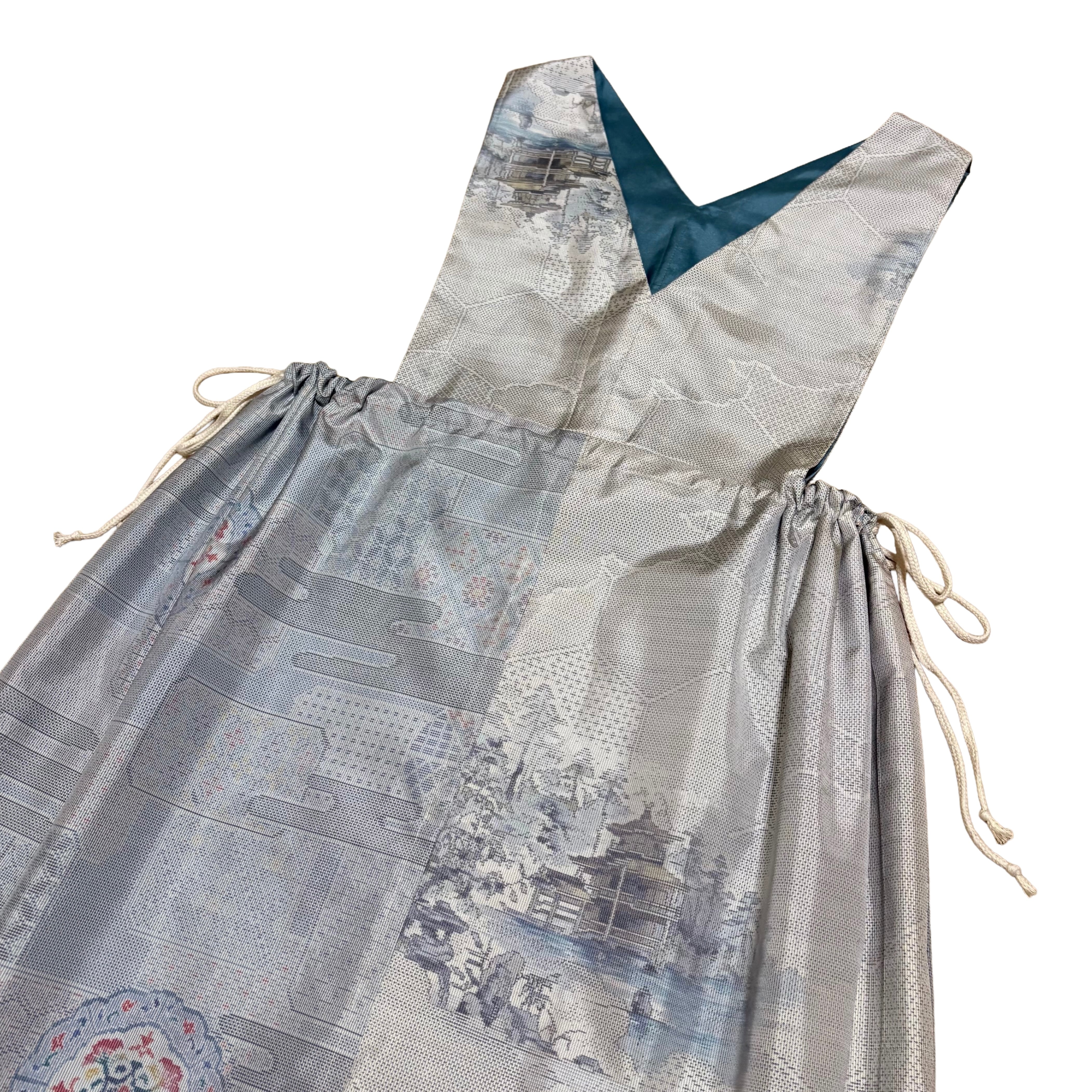大島紬 着物リメイク ジャンパースカート 巾着スタイル 白大島 亀甲京風景文様×器物文様 オーガニックコットンひも 幅広ウエスト ロング マキシ丈