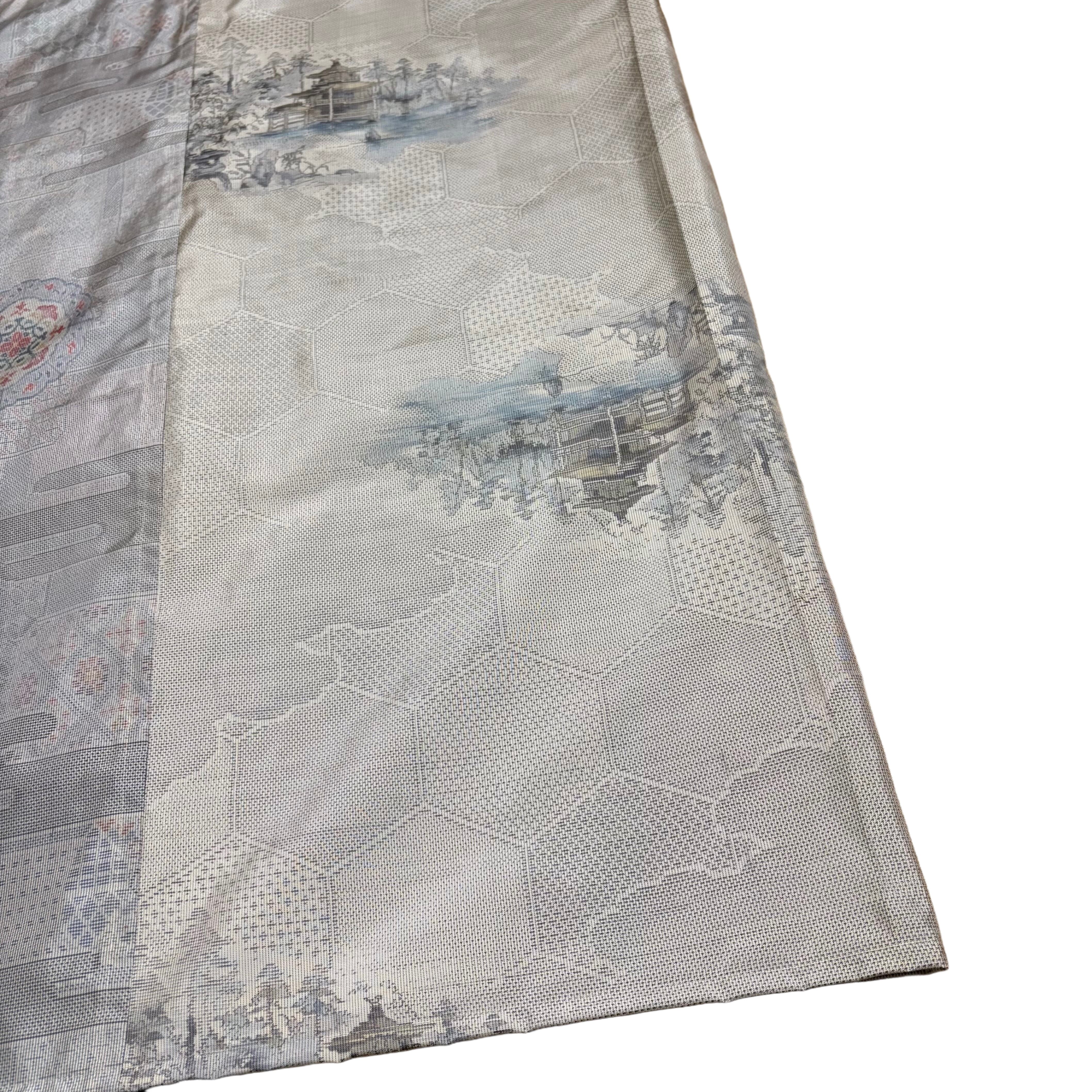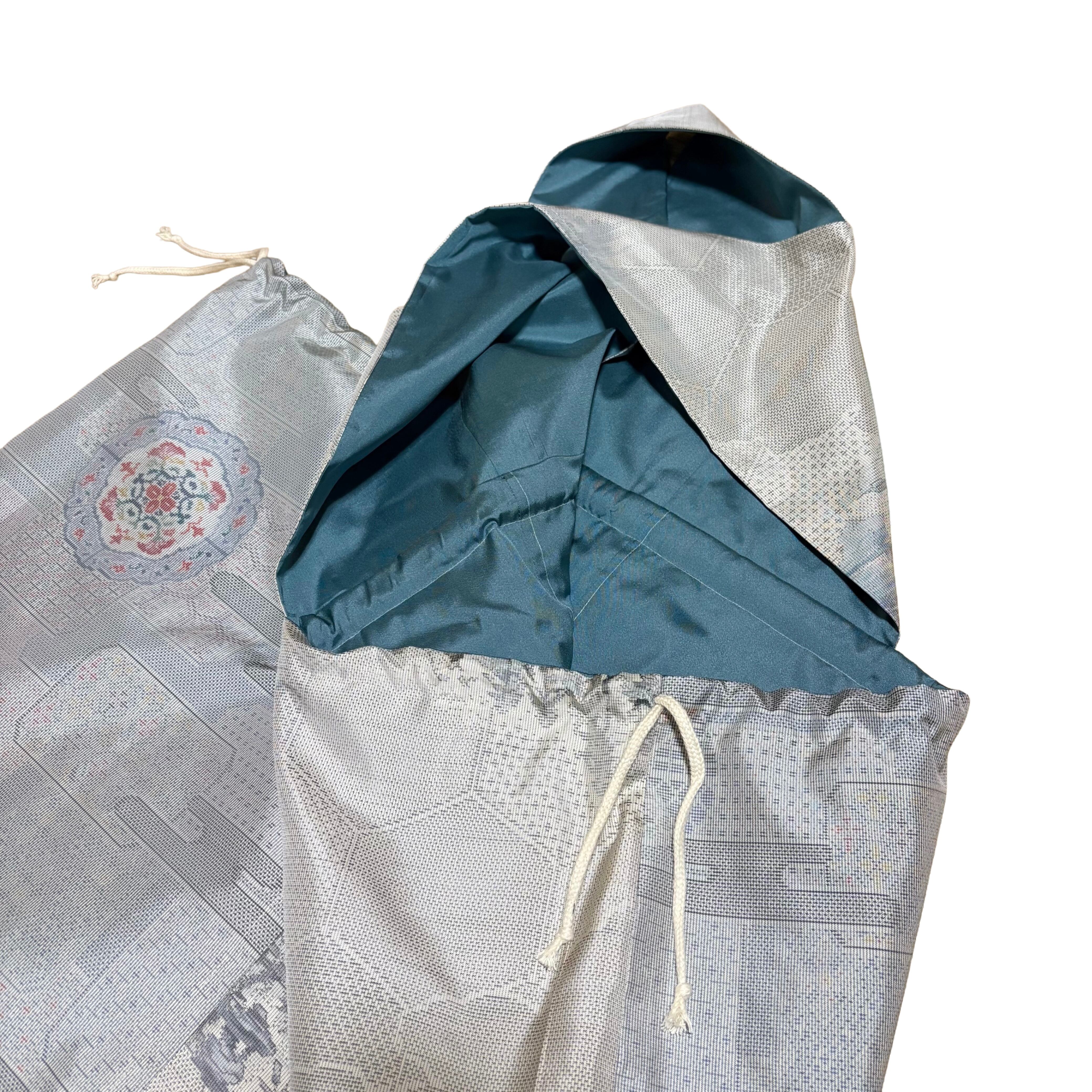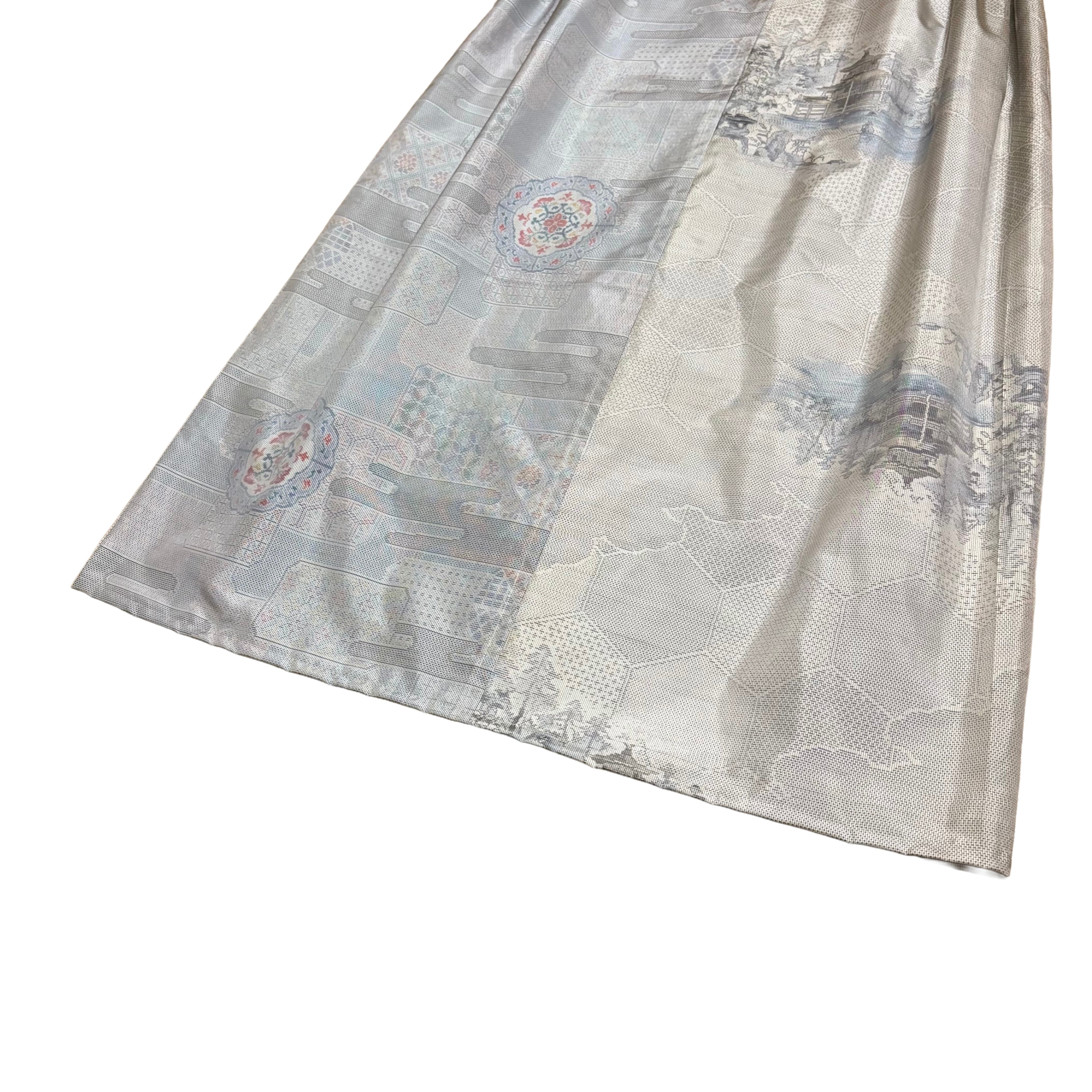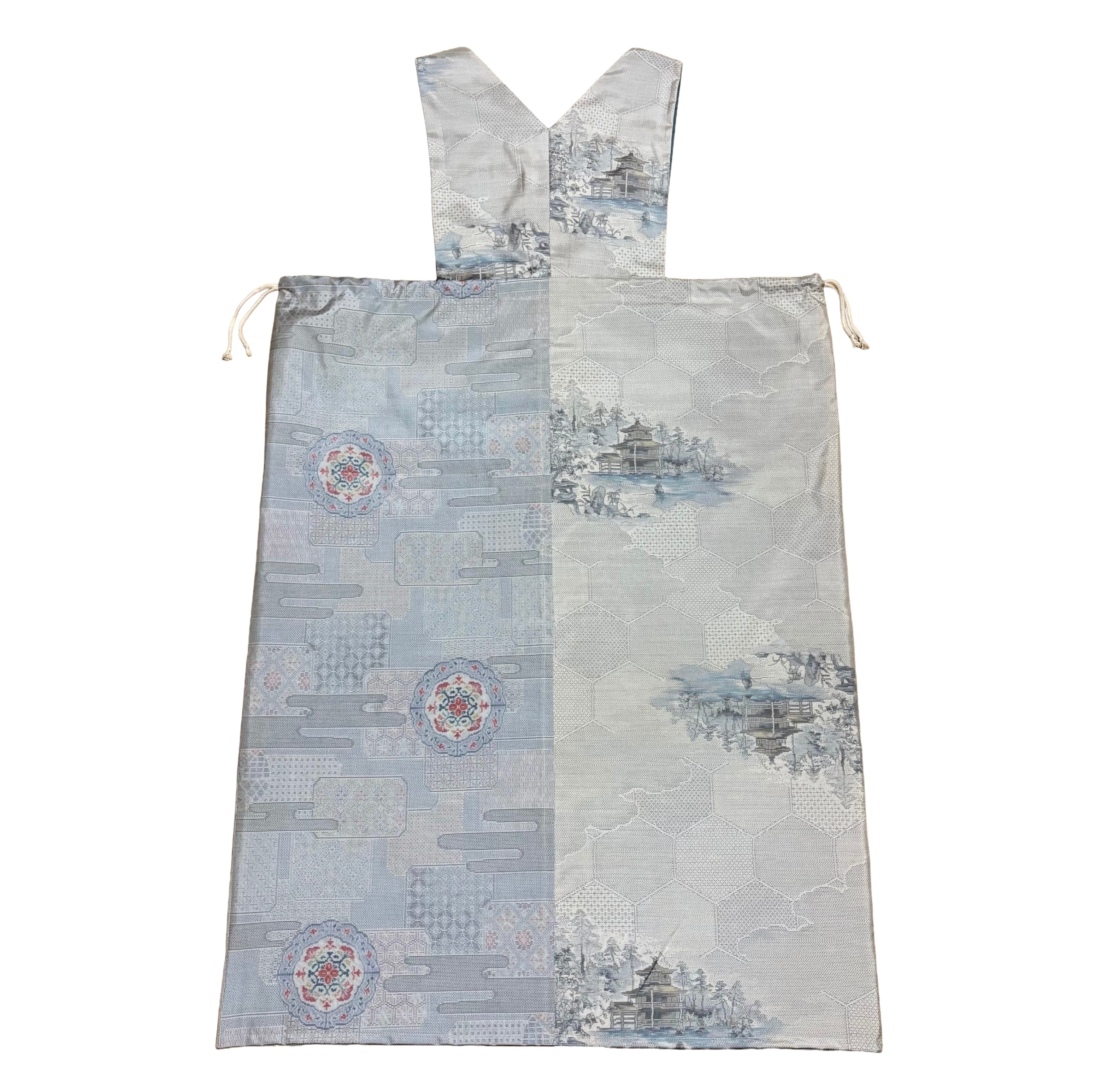 大島紬 着物リメイク ジャンパースカート 巾着スタイル 白大島 亀甲京風景文様×器物文様 オーガニックコットンひも 幅広ウエスト ロング マキシ丈