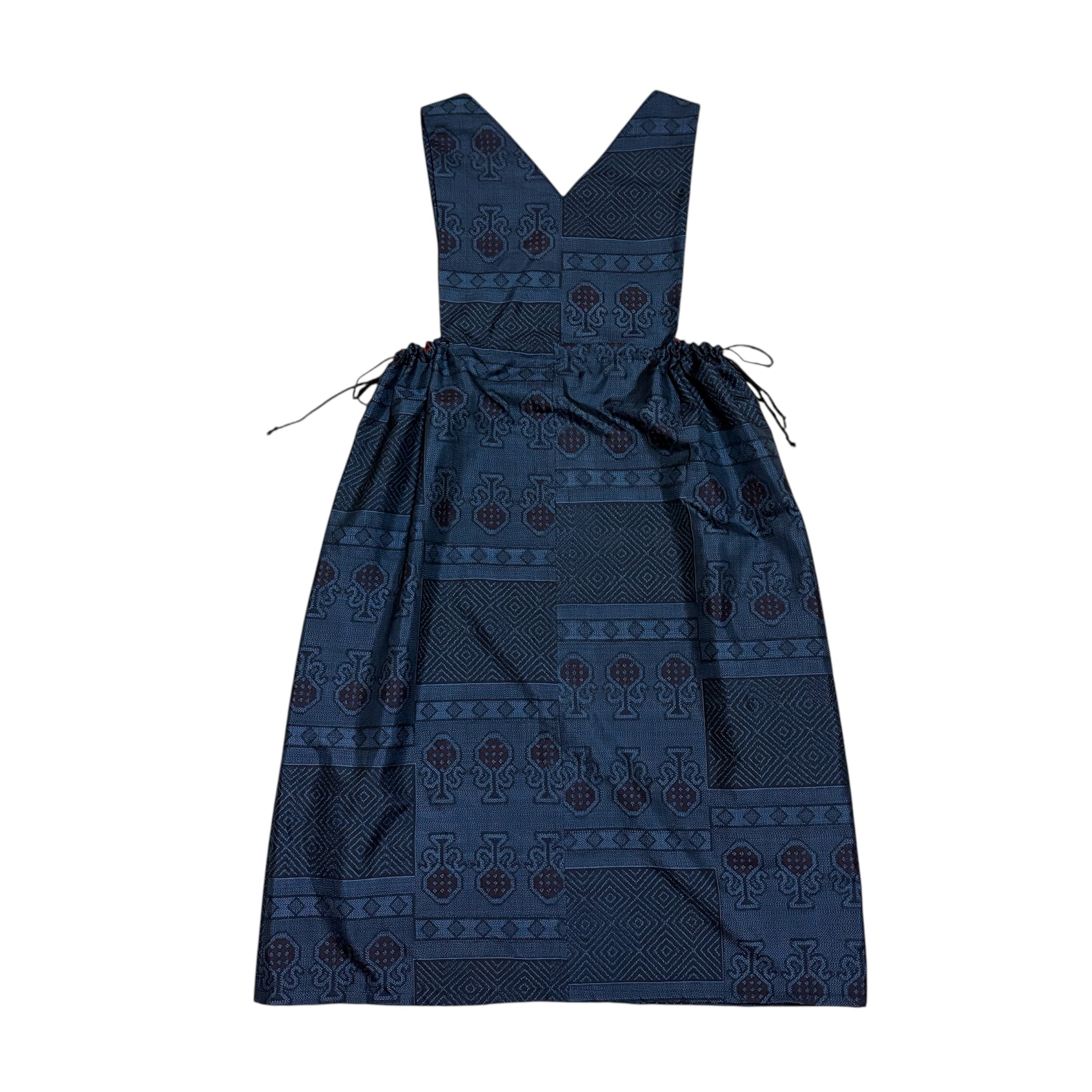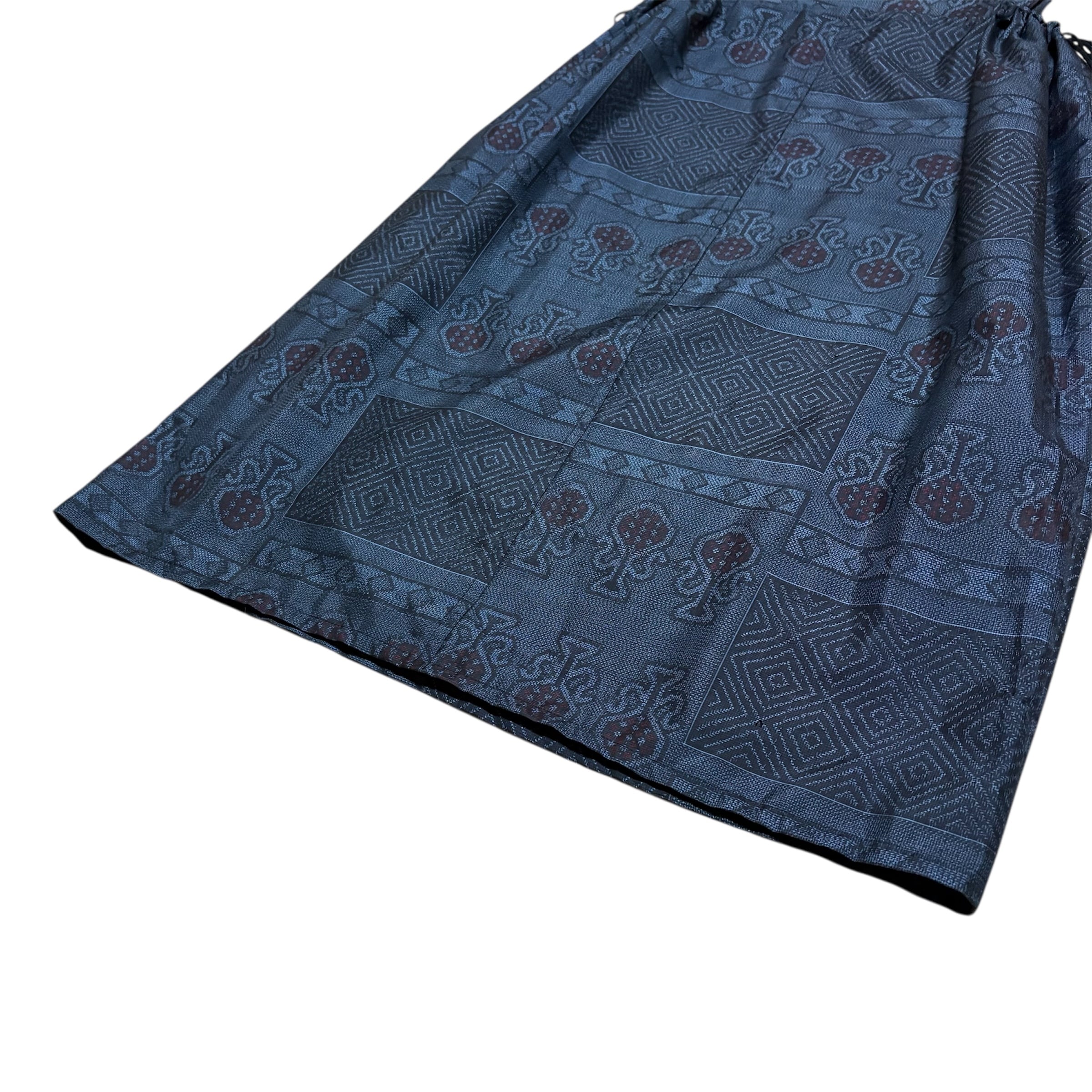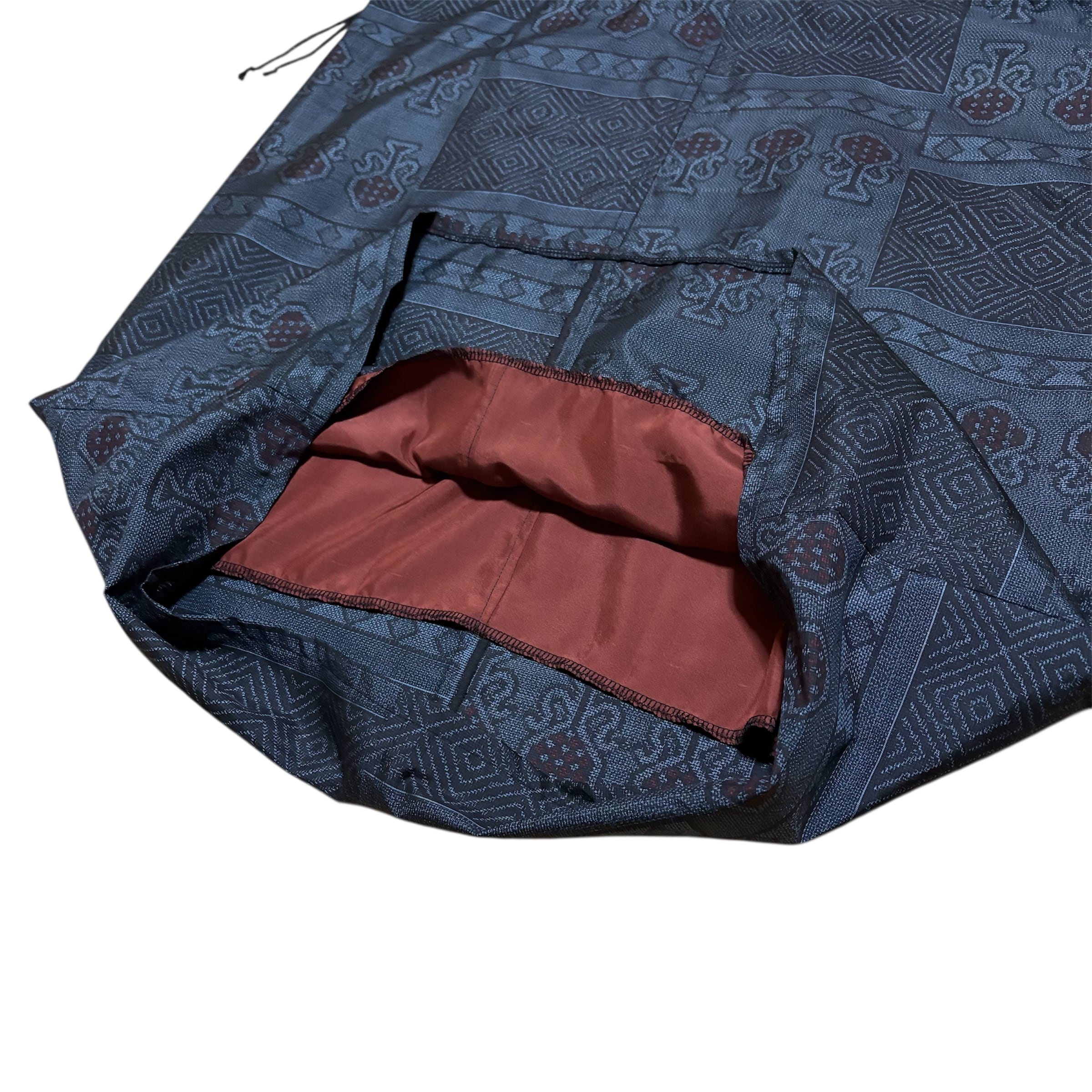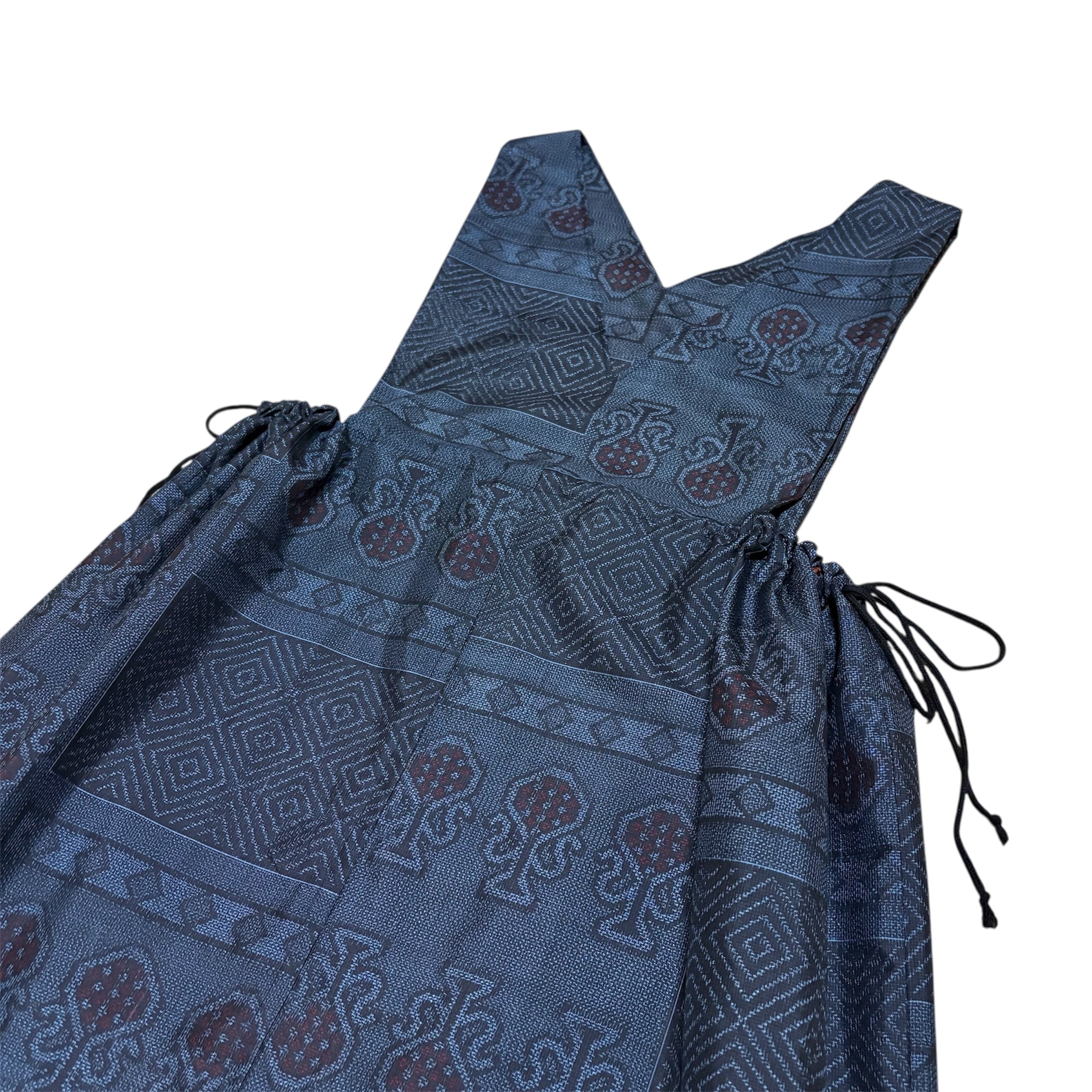 大島紬 着物リメイク ジャンパースカート 巾着スタイル 陶器文様 壺柄 正絹 幅広ウエスト ロング