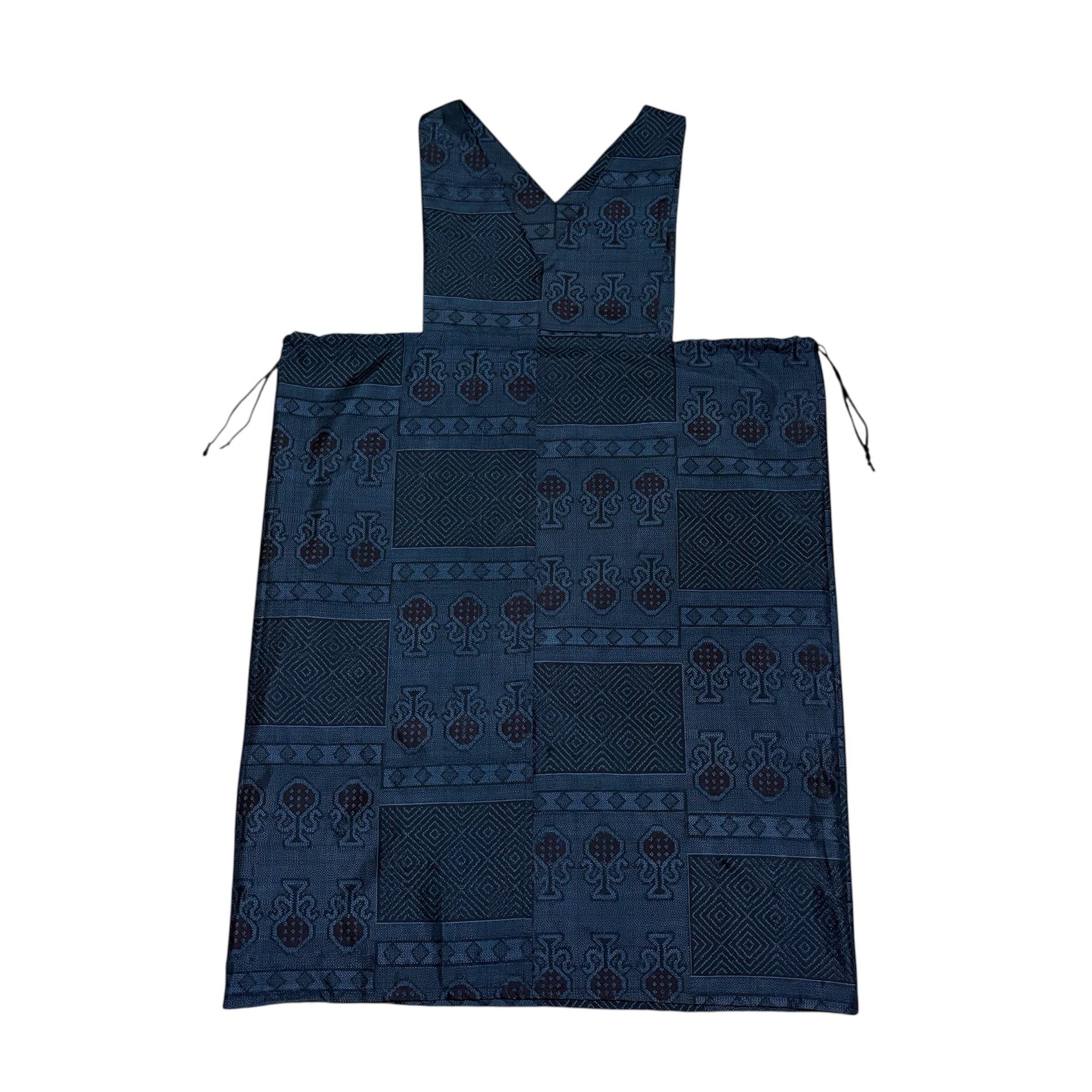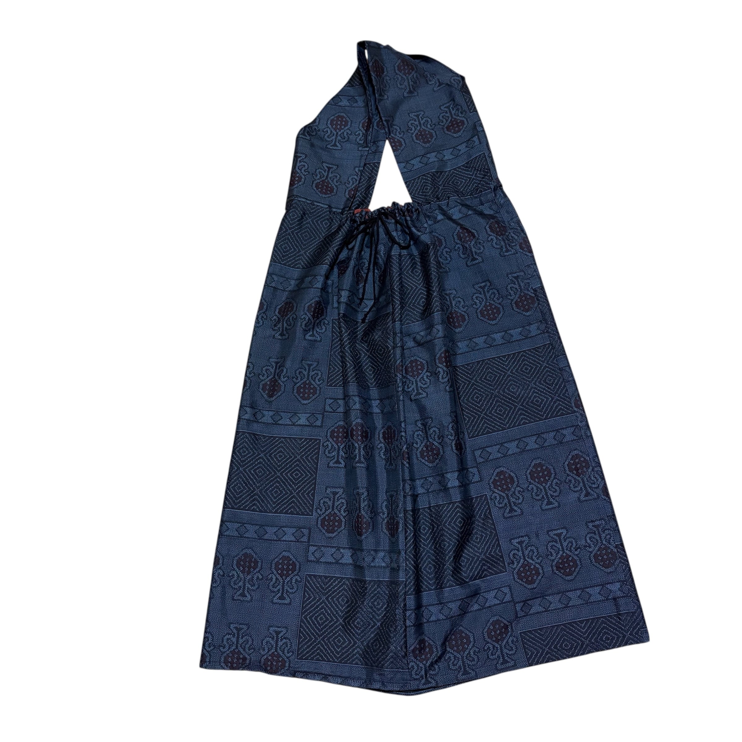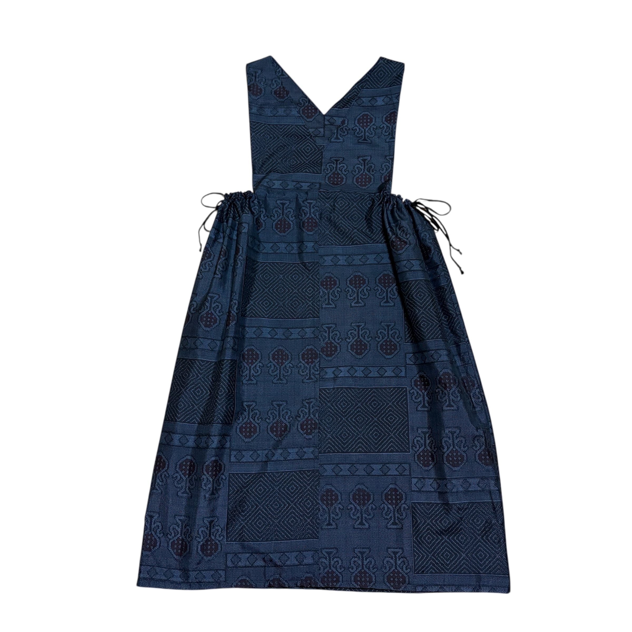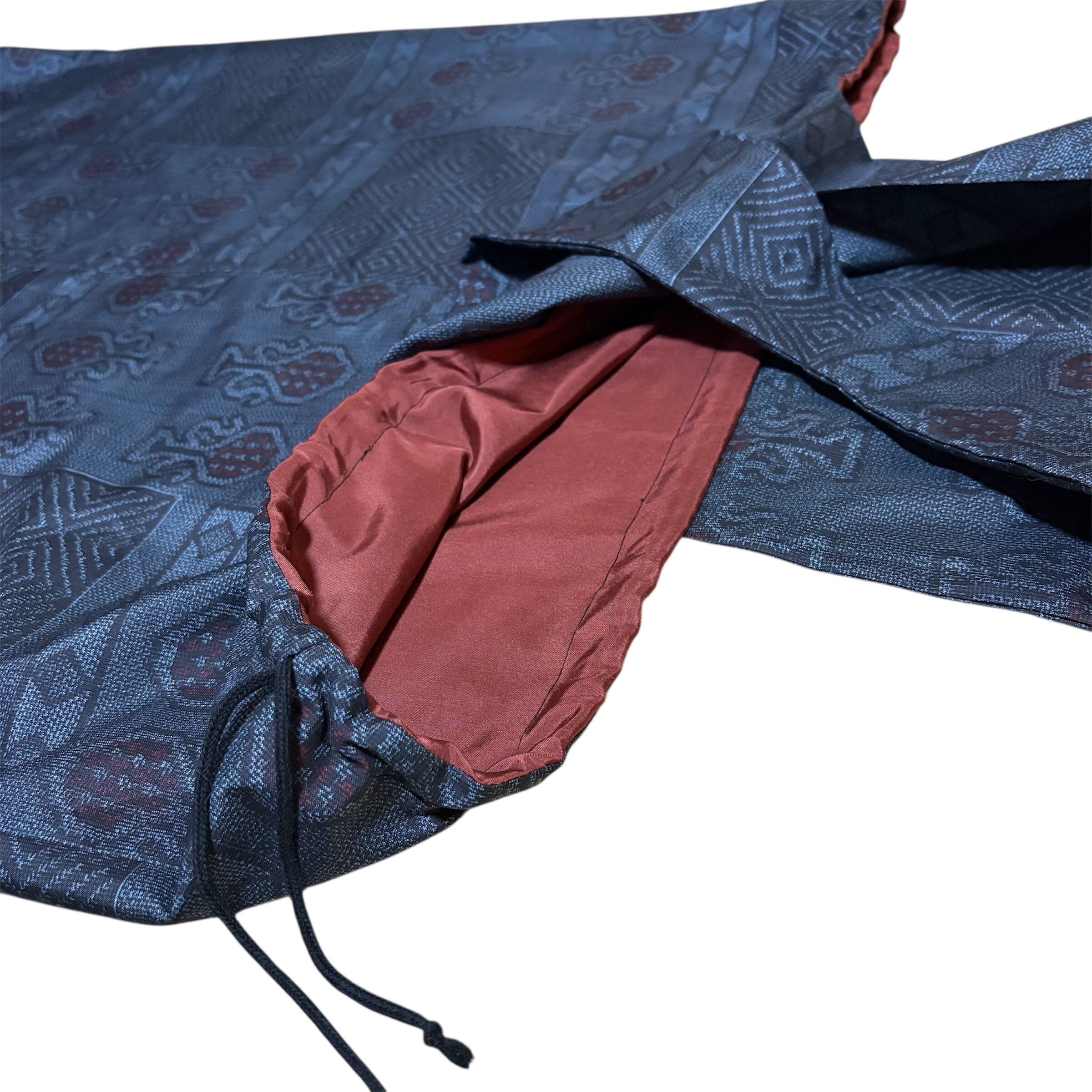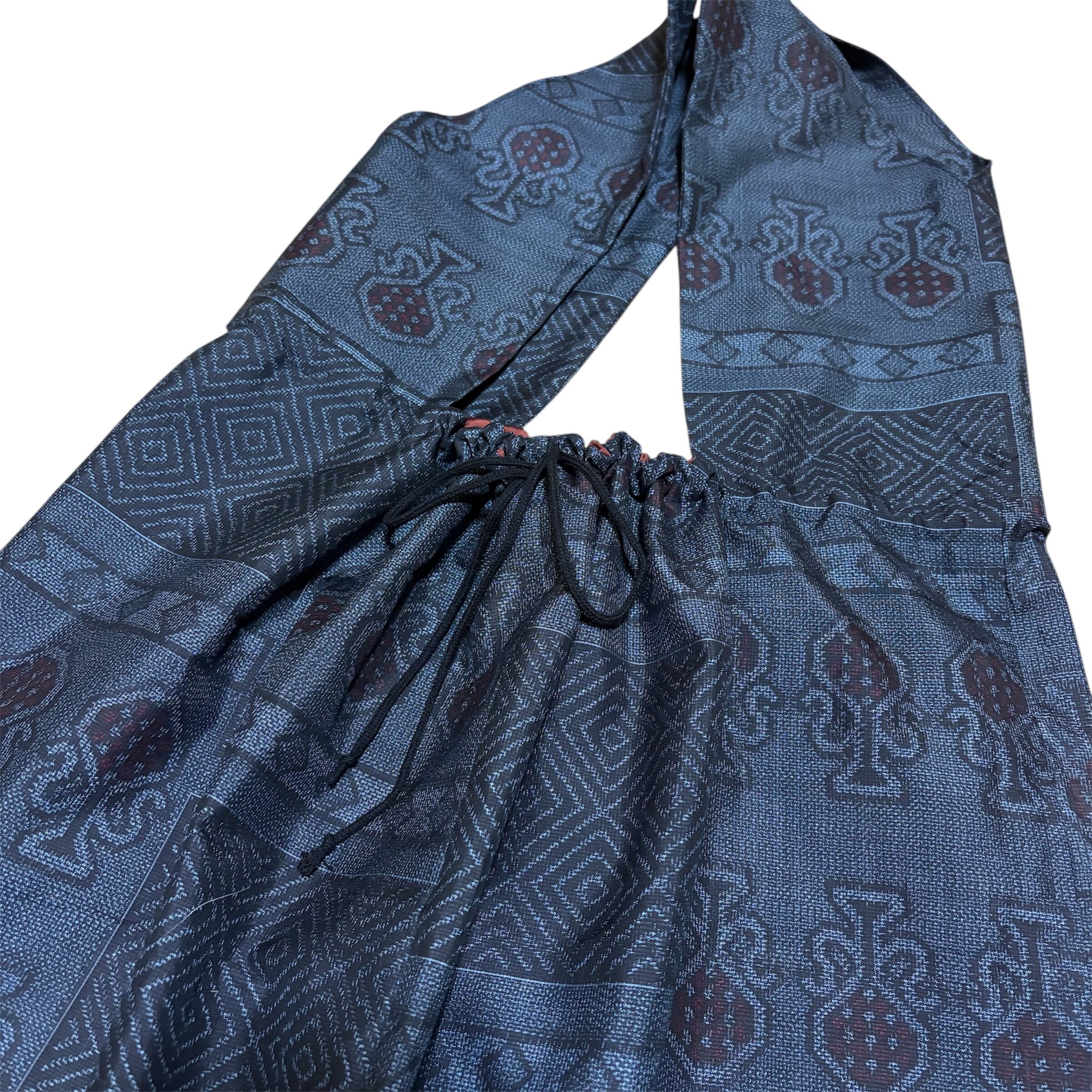 大島紬 着物リメイク ジャンパースカート 巾着スタイル 陶器文様 壺柄 正絹 幅広ウエスト ロング
