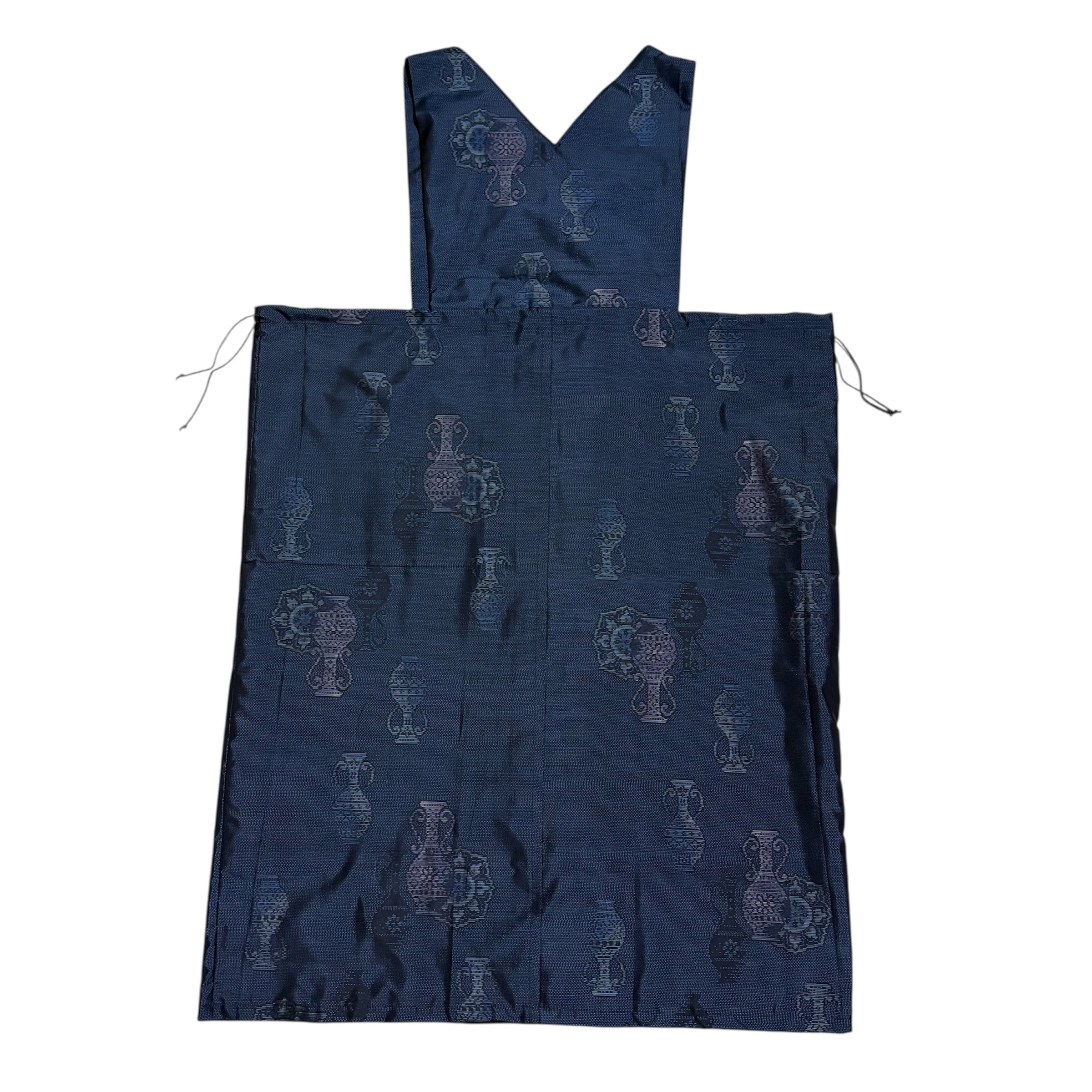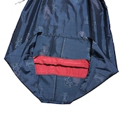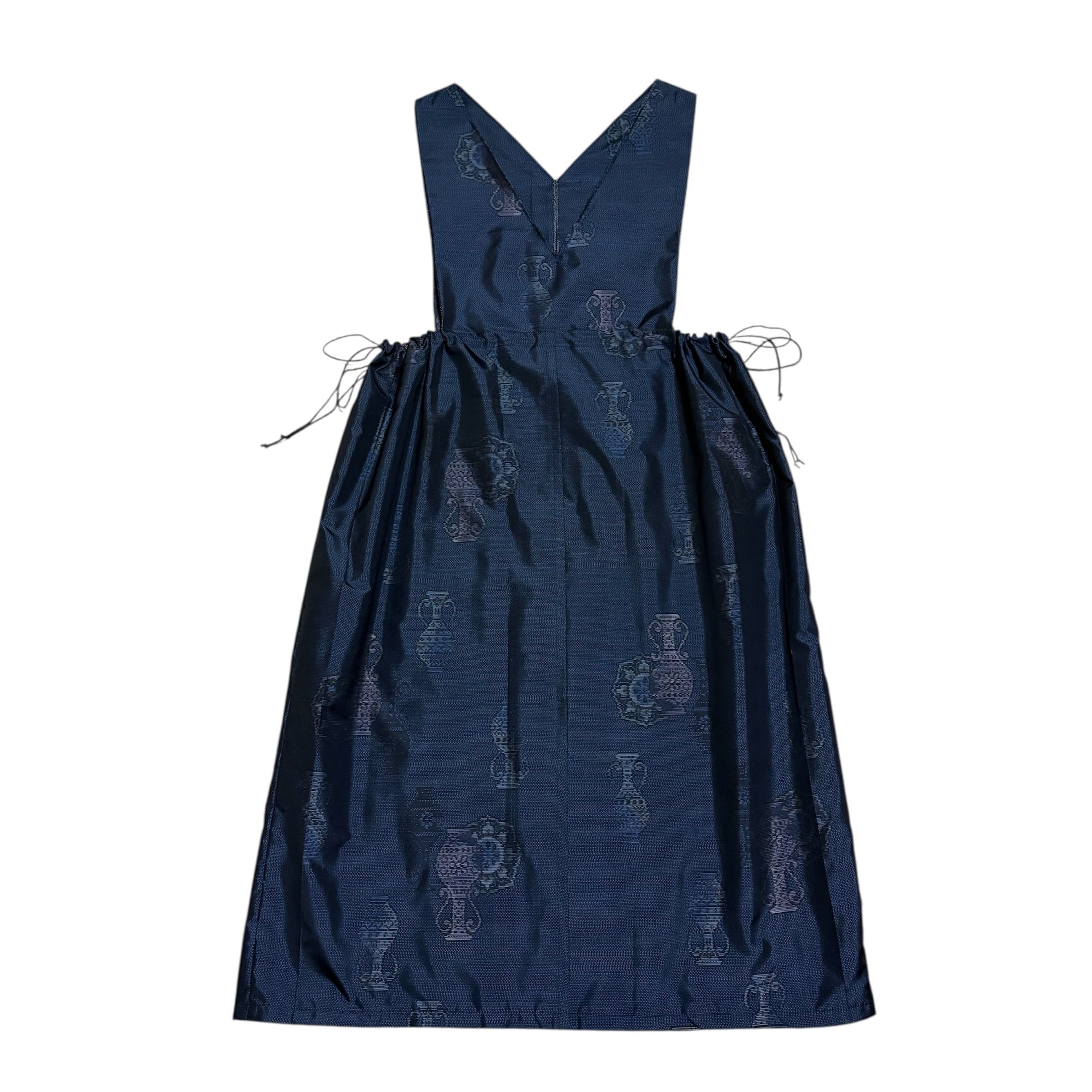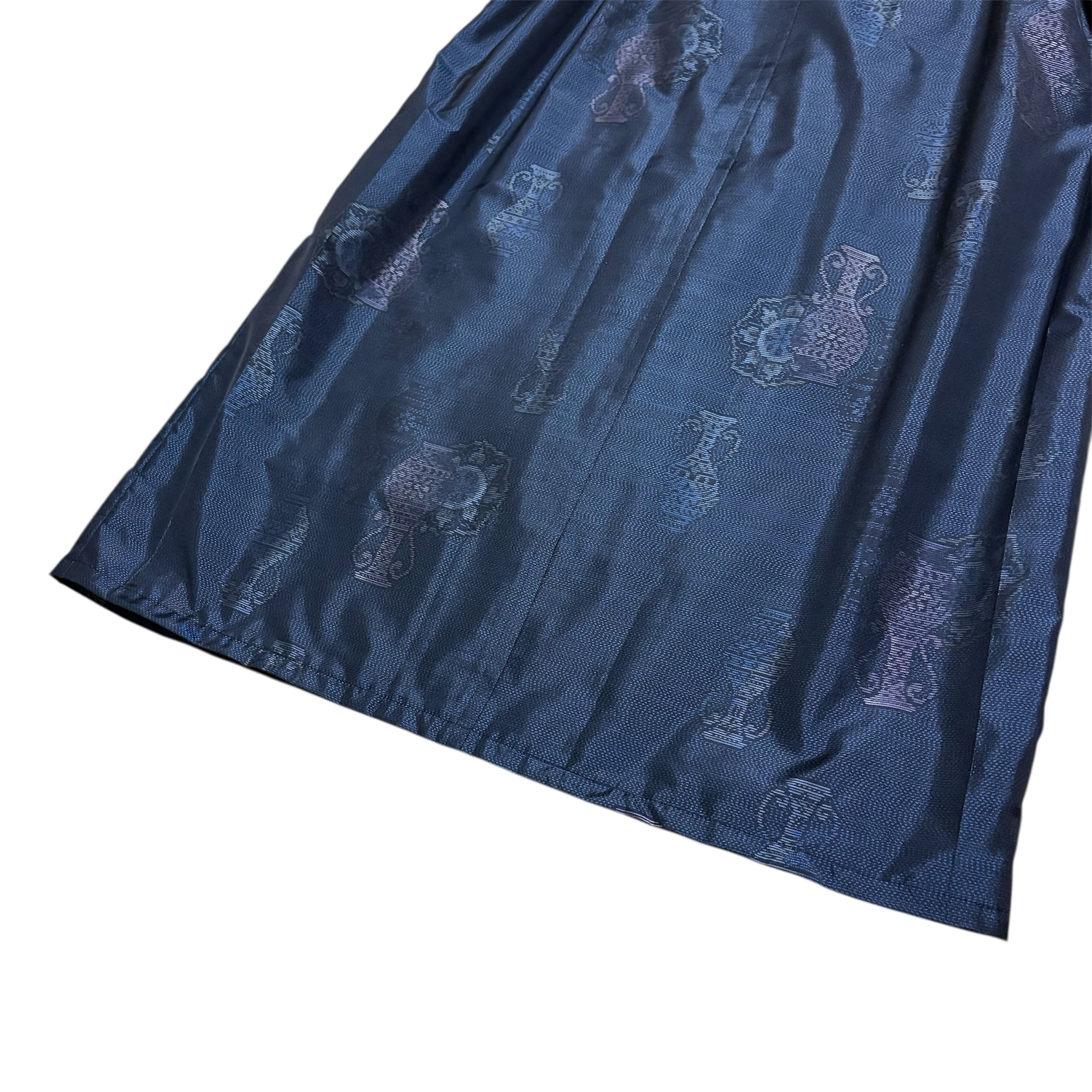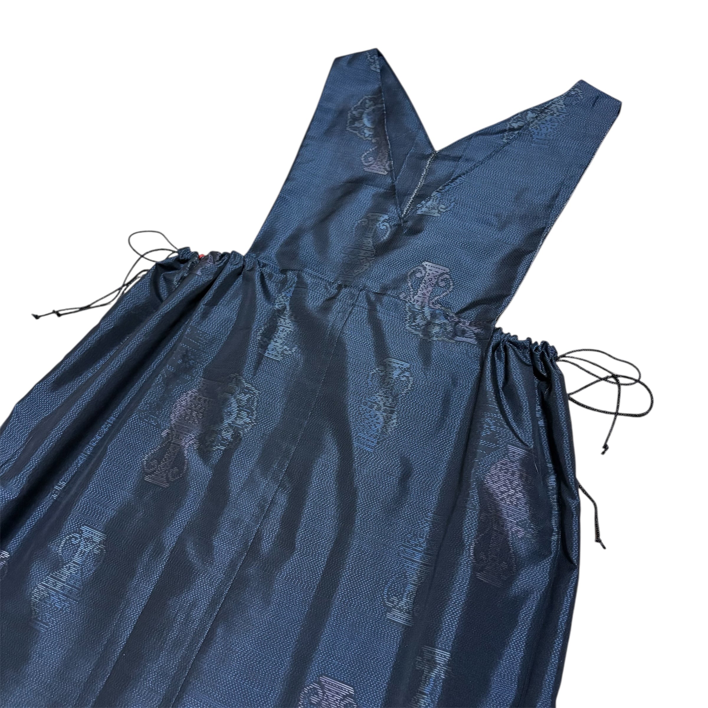 本場大島紬 着物リメイク ジャンパースカート 巾着スタイル 泥染め 陶器絵皿花文様 壺柄 正絹 幅広ウエスト ロング 打掛ひも