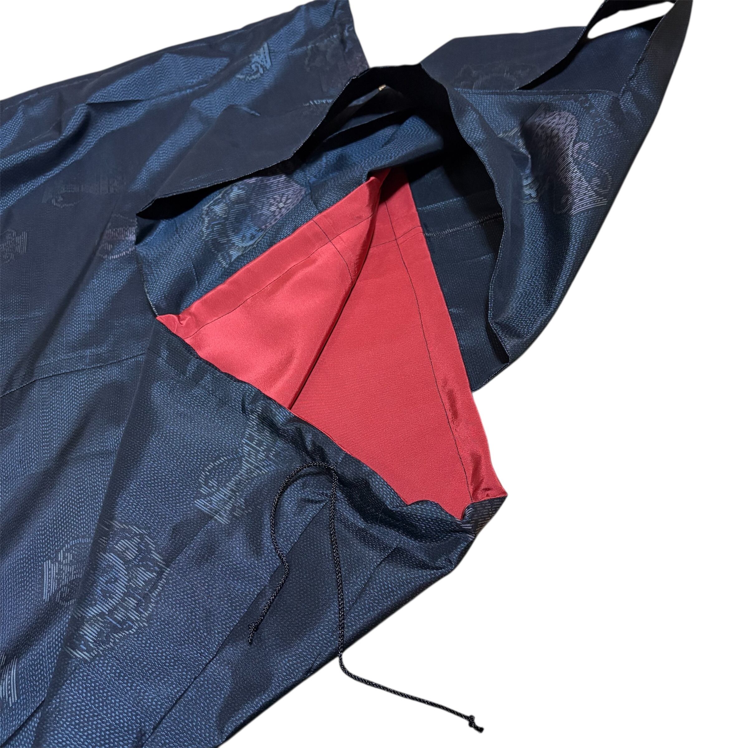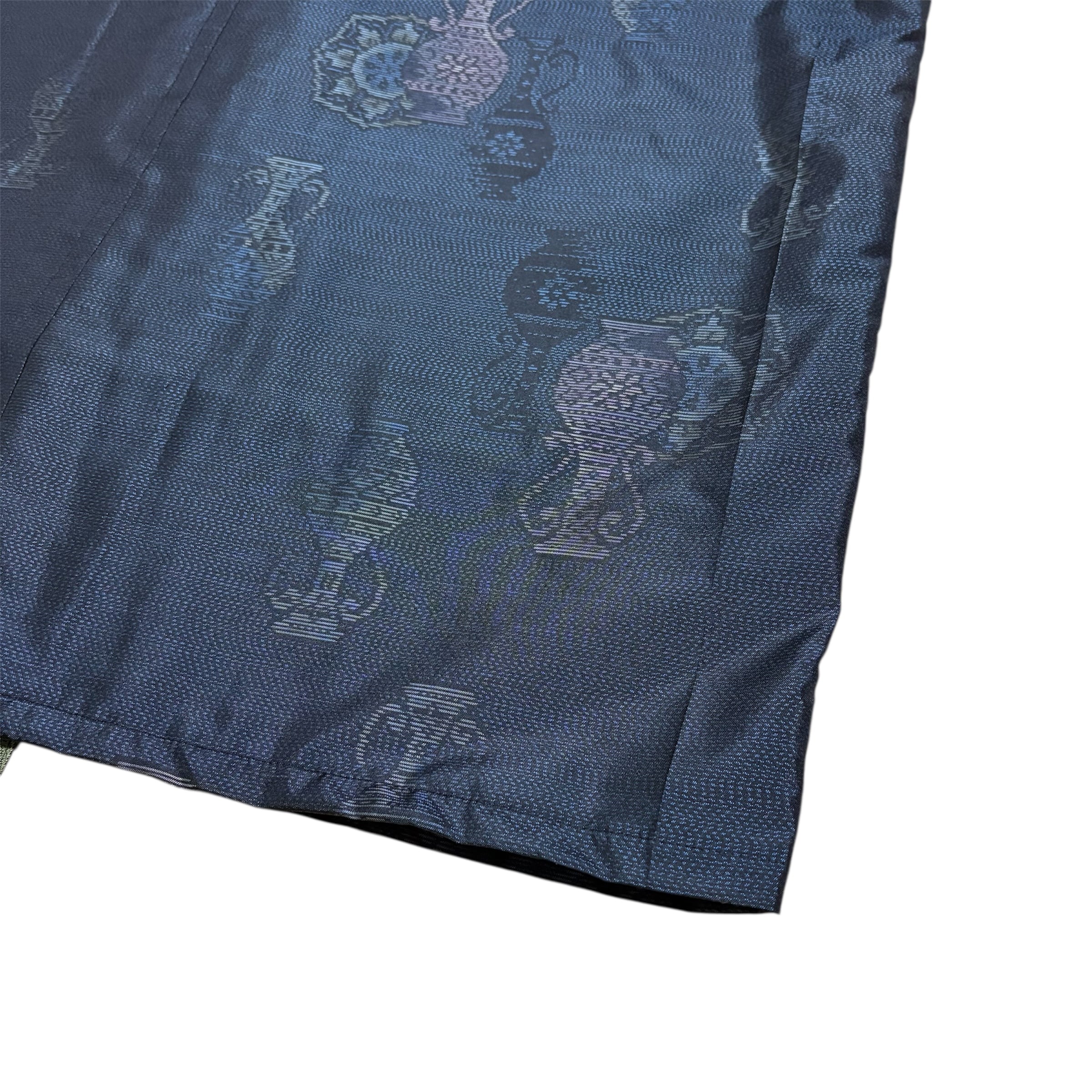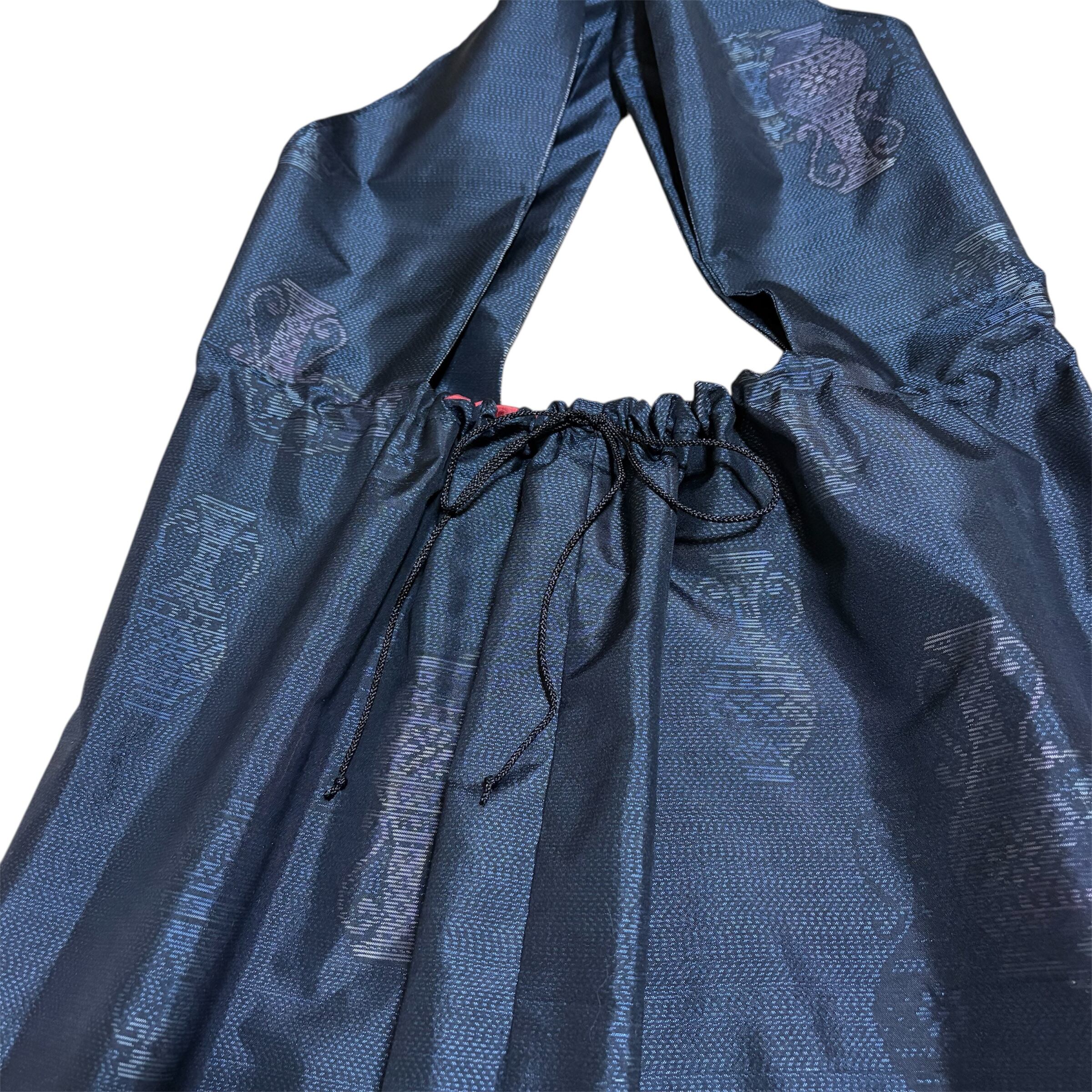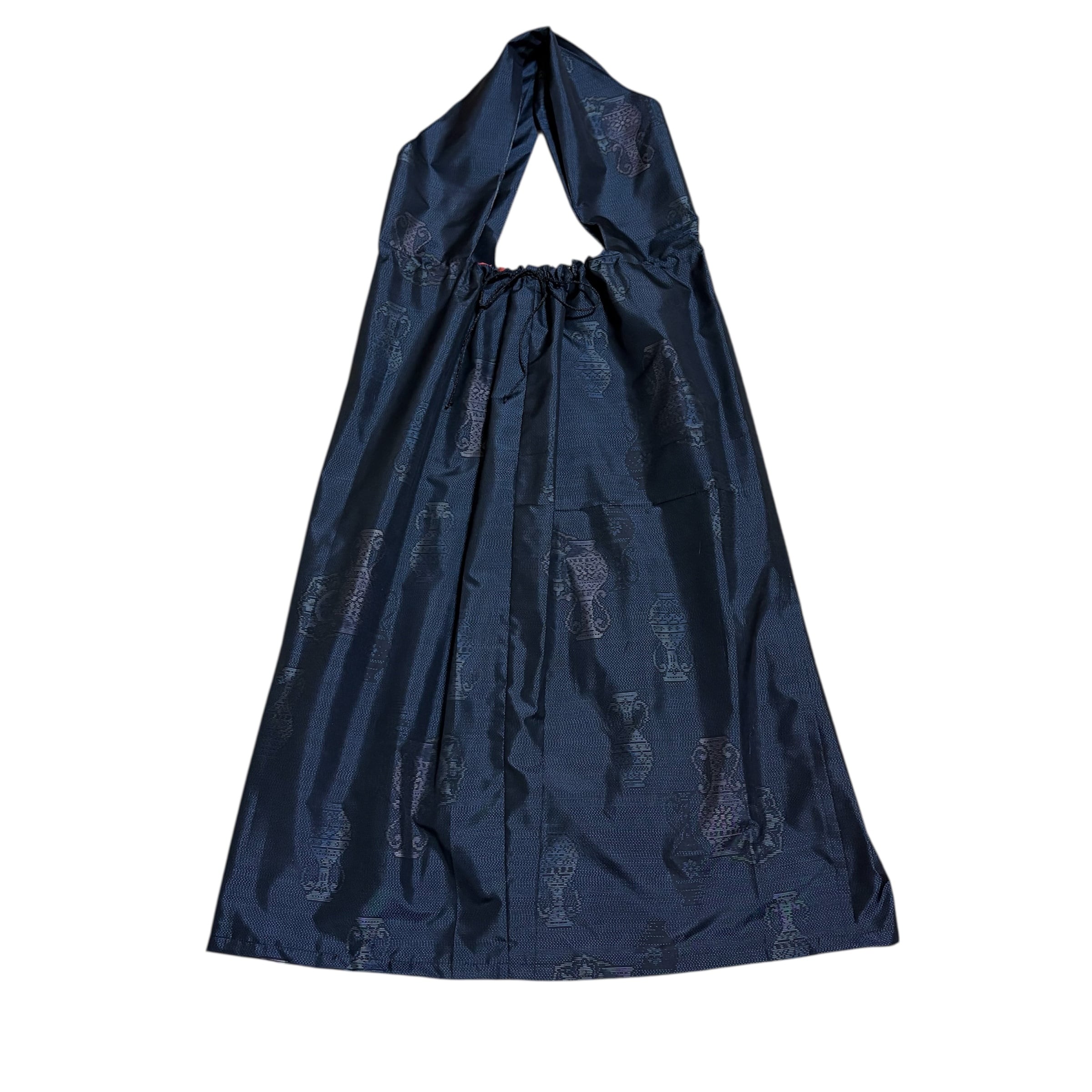 本場大島紬 着物リメイク ジャンパースカート 巾着スタイル 泥染め 陶器絵皿花文様 壺柄 正絹 幅広ウエスト ロング 打掛ひも