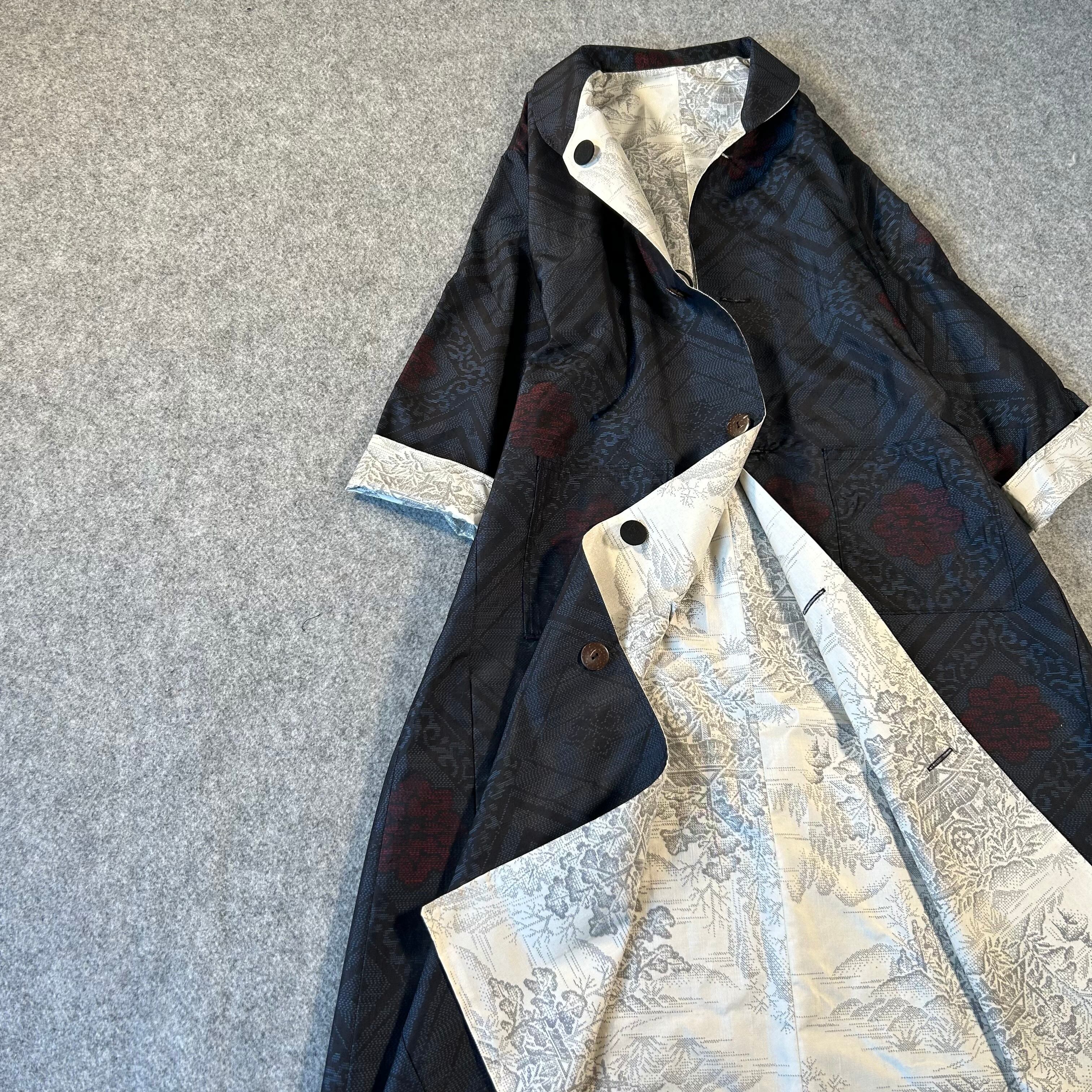 着物リメイク 白大島 リバーシブル ロング コート マキシ 古布 羽織