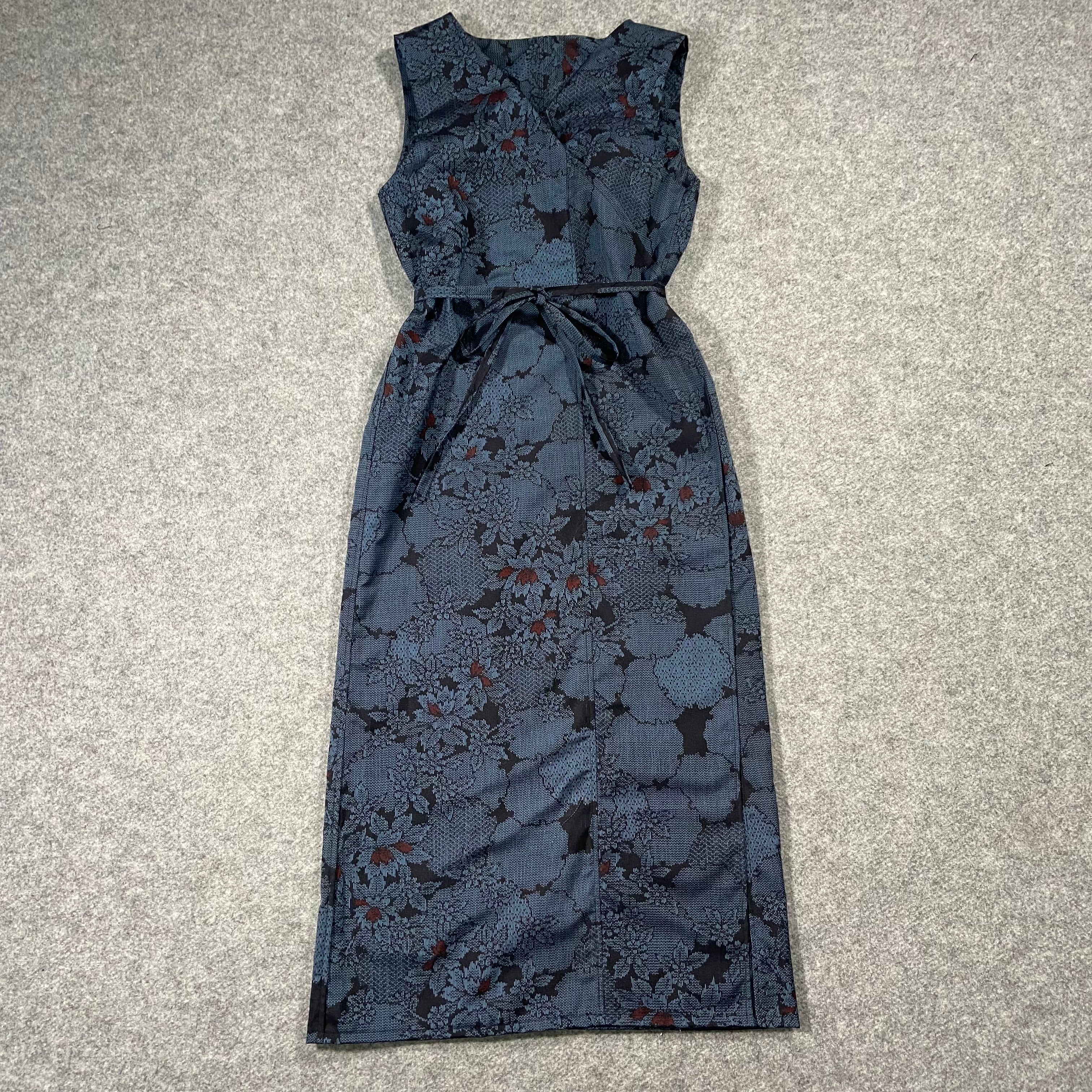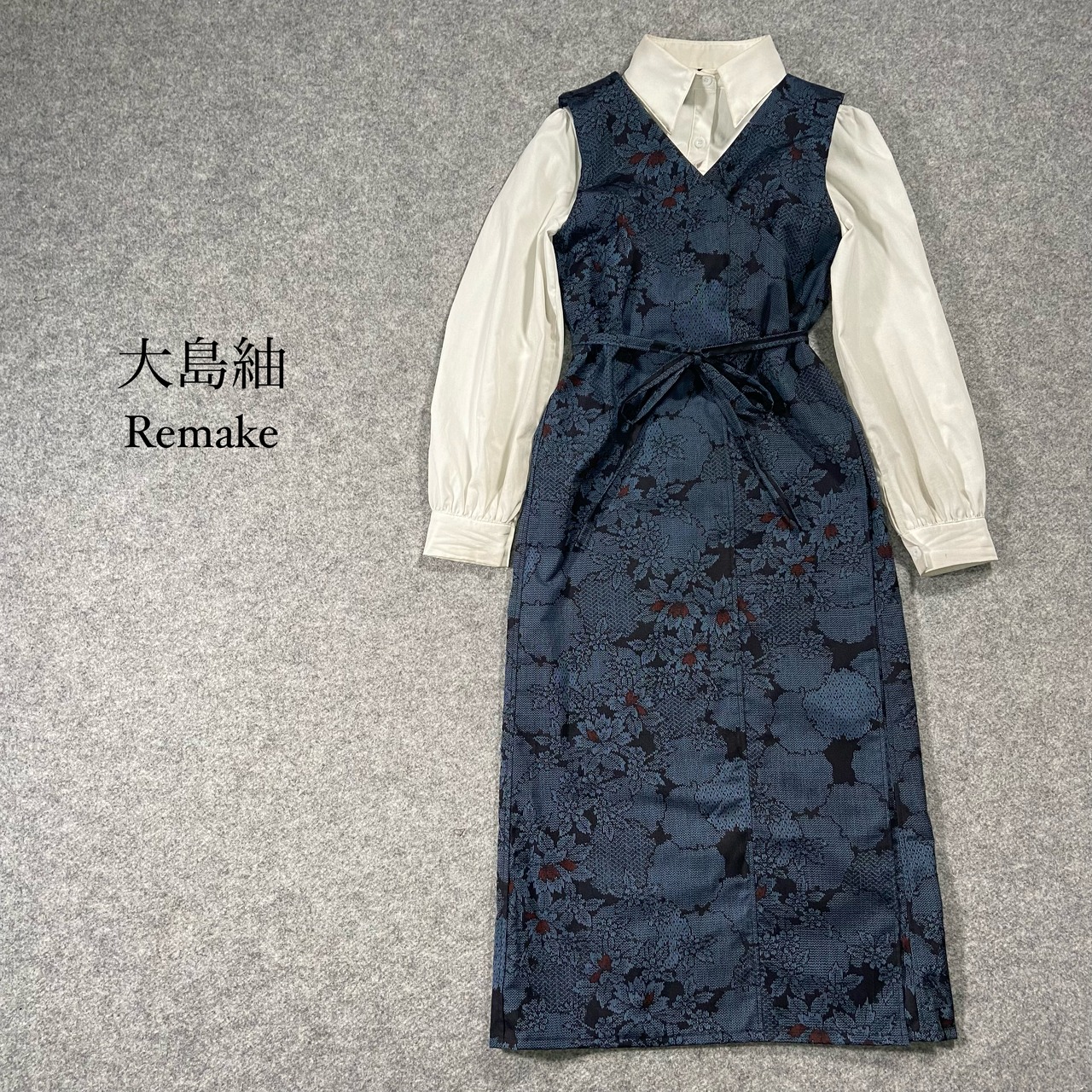 大島紬 カシュクールワンピース 着物リメイク 花柄 ロング 羽織 F ブルー