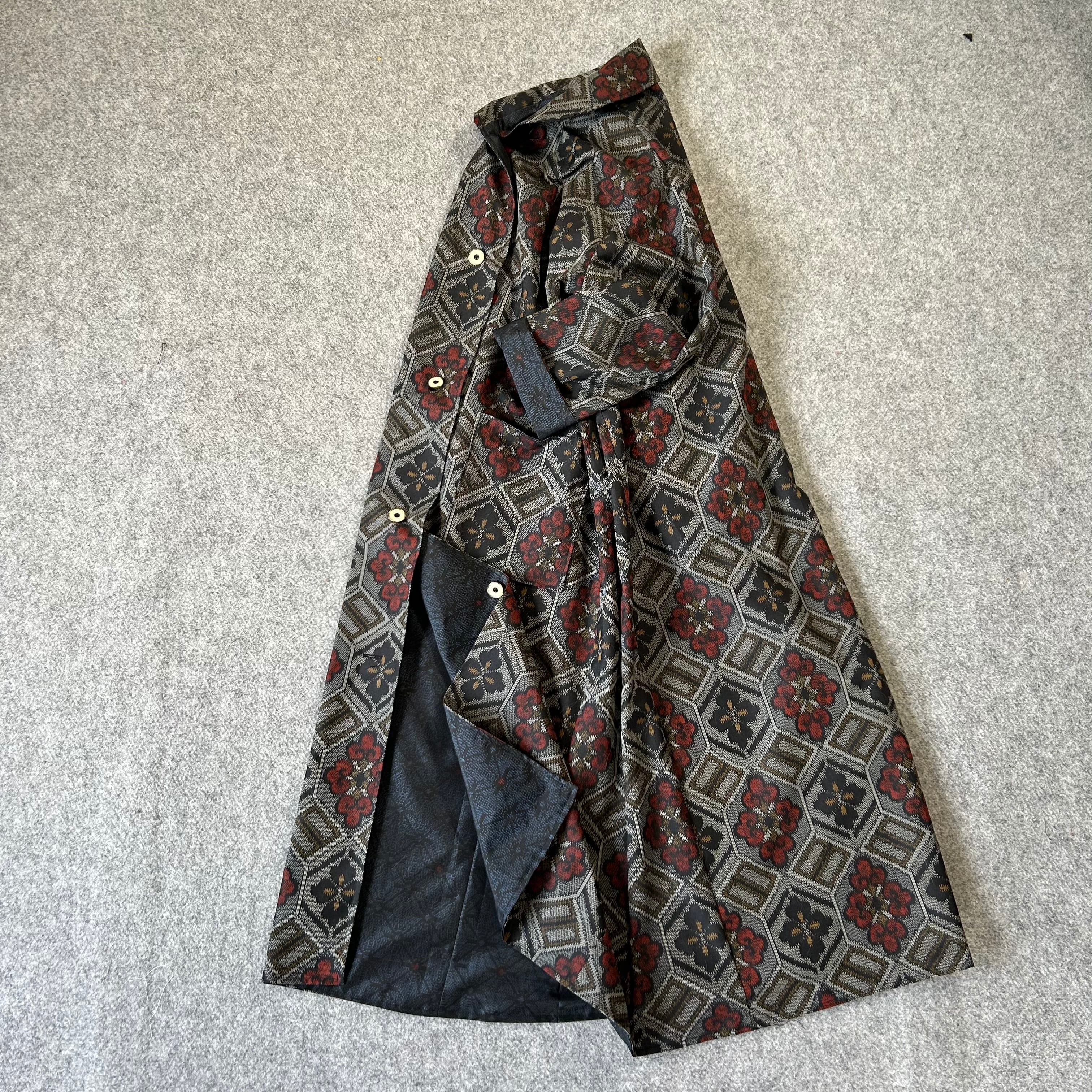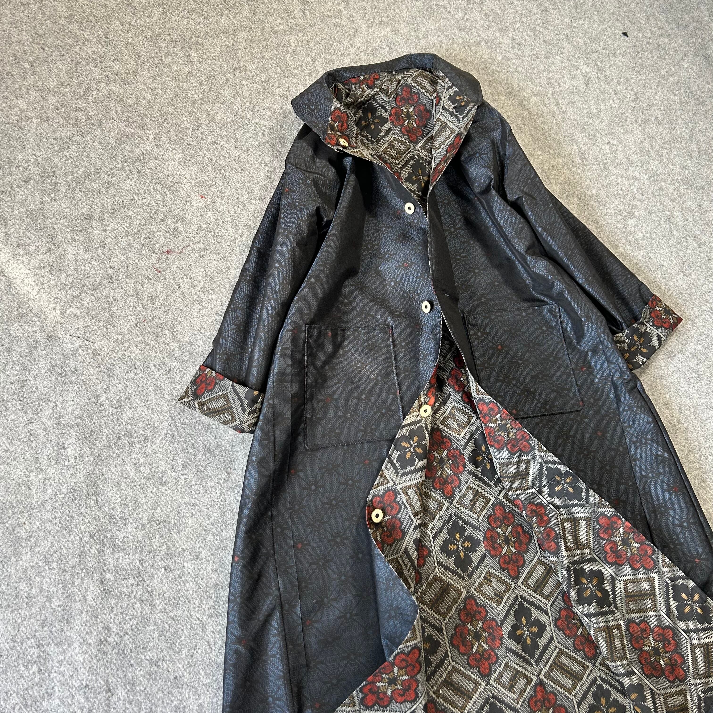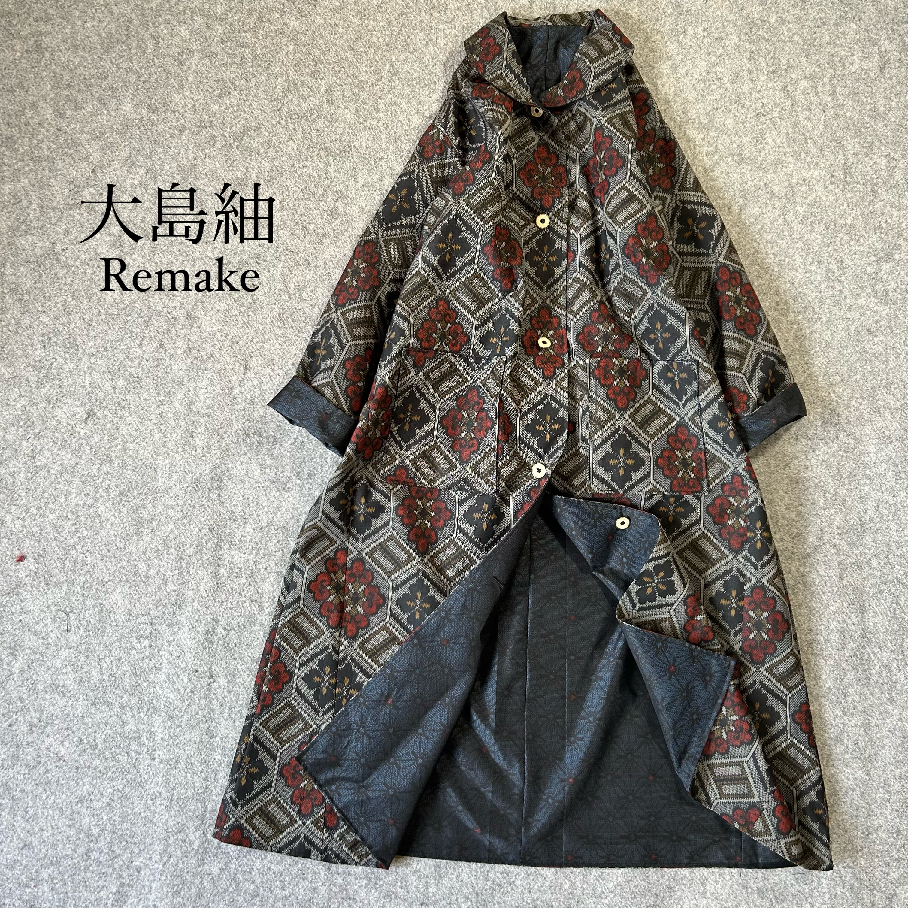 大島紬 着物リメイク 椿花柄 リバーシブル ロング コート マキシ 古布 羽織