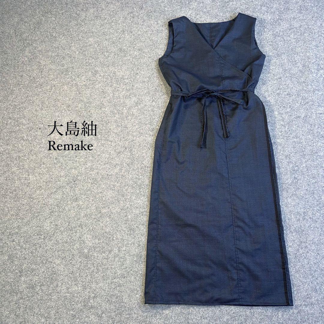 大島紬 カシュクールワンピース 着物リメイク 亀甲柄 ロング 羽織 F ネイビー