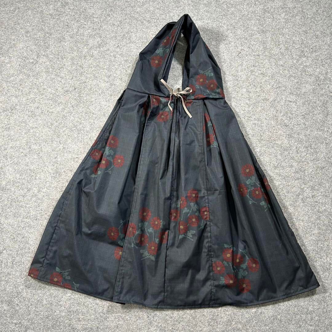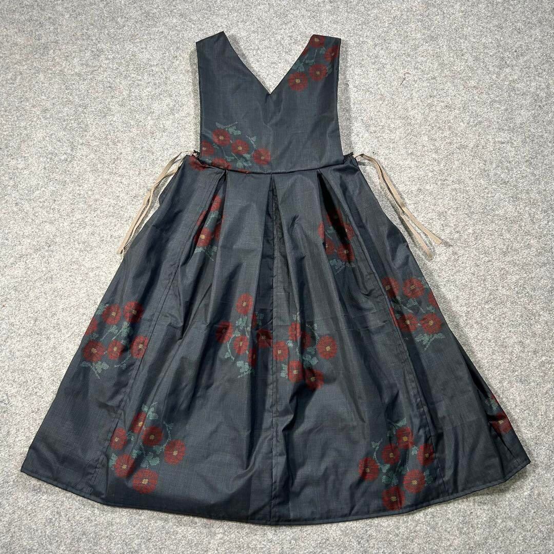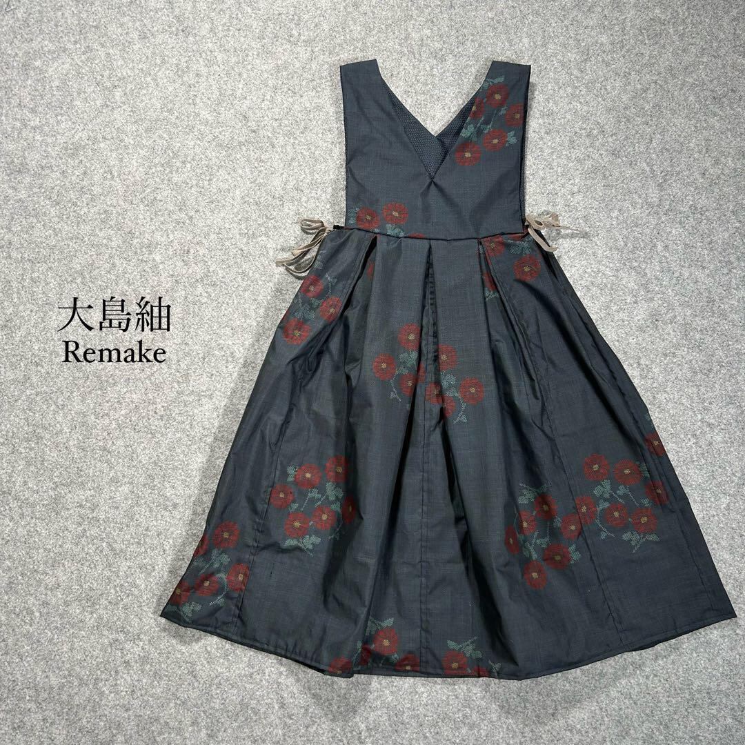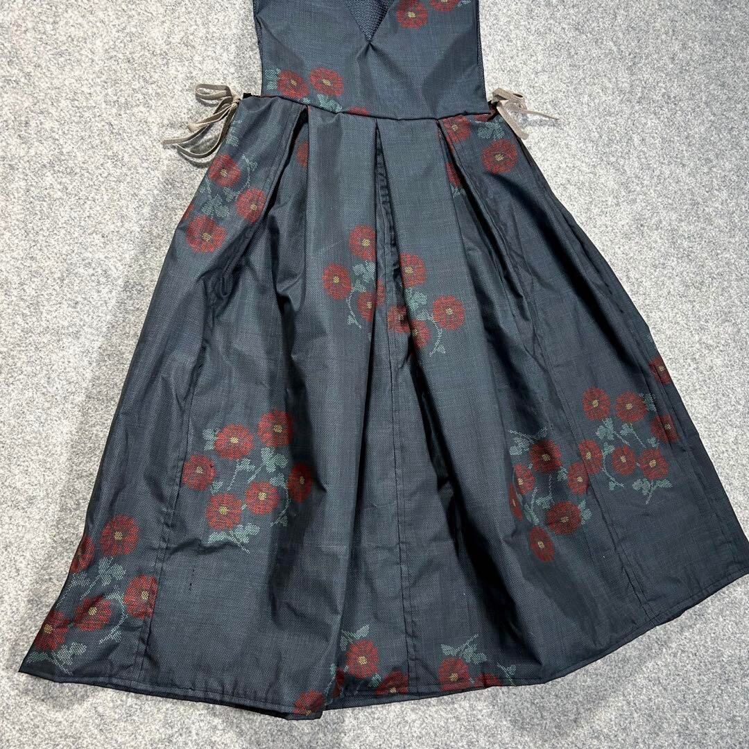 大島紬 ジャンパースカート 花柄 ネイビー ボックスプリーツ サイドリボンひも