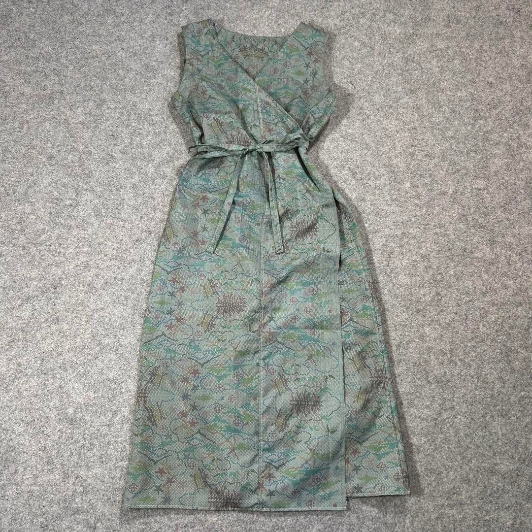大島紬 カシュクールワンピース ドレス 着物リメイク ブルー 水色 風景柄 F