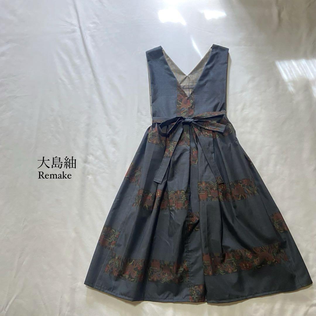 大島紬 ジャンパースカート ボックスプリーツ 横段人物鳥獣文様 ベルトリボン